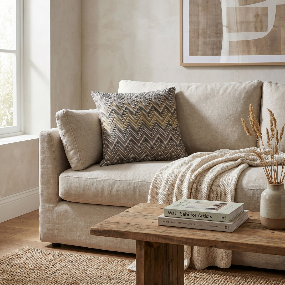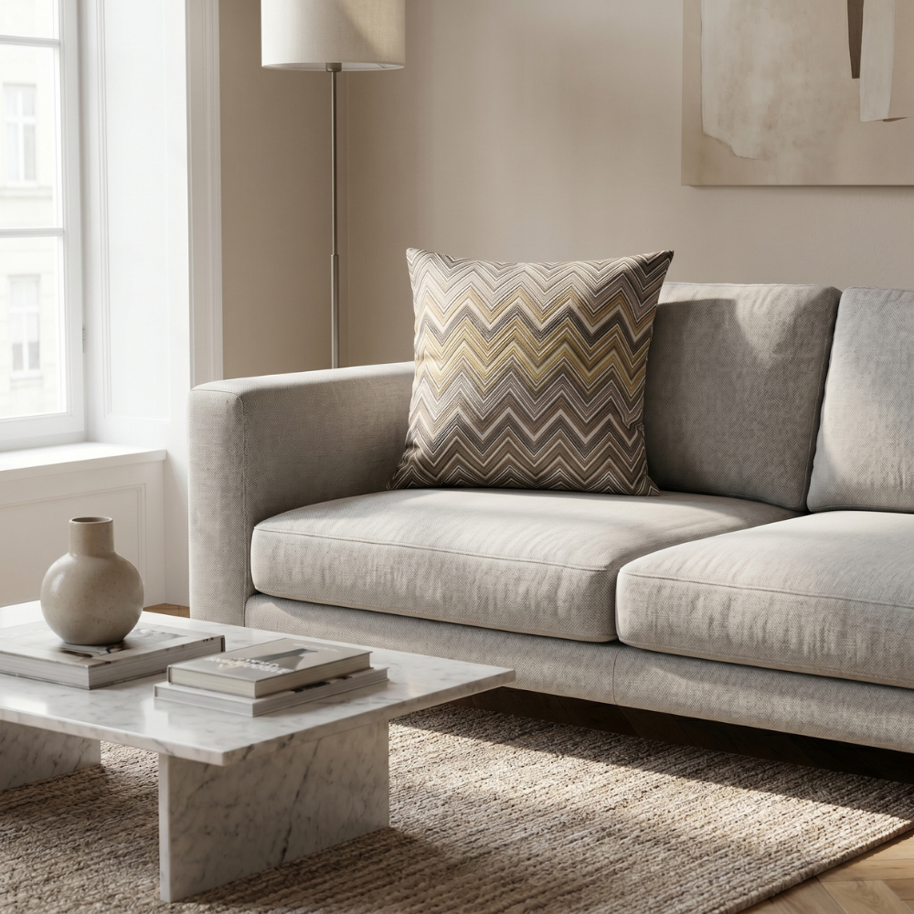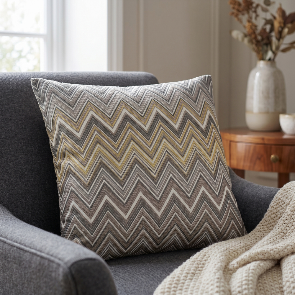 Zigzag (chevron) desenin ritmik geometrisi ile antrasit ve altın tonlarının dengeli uyumu birleşerek mekâna lüks ve modern bir atmosfer kazandırır. Bu özel tasarım yastık, zarif ışıltı etkisi ile dekorasyona sofistike bir dokunuş ekleyen zamansız bir stil sunar.