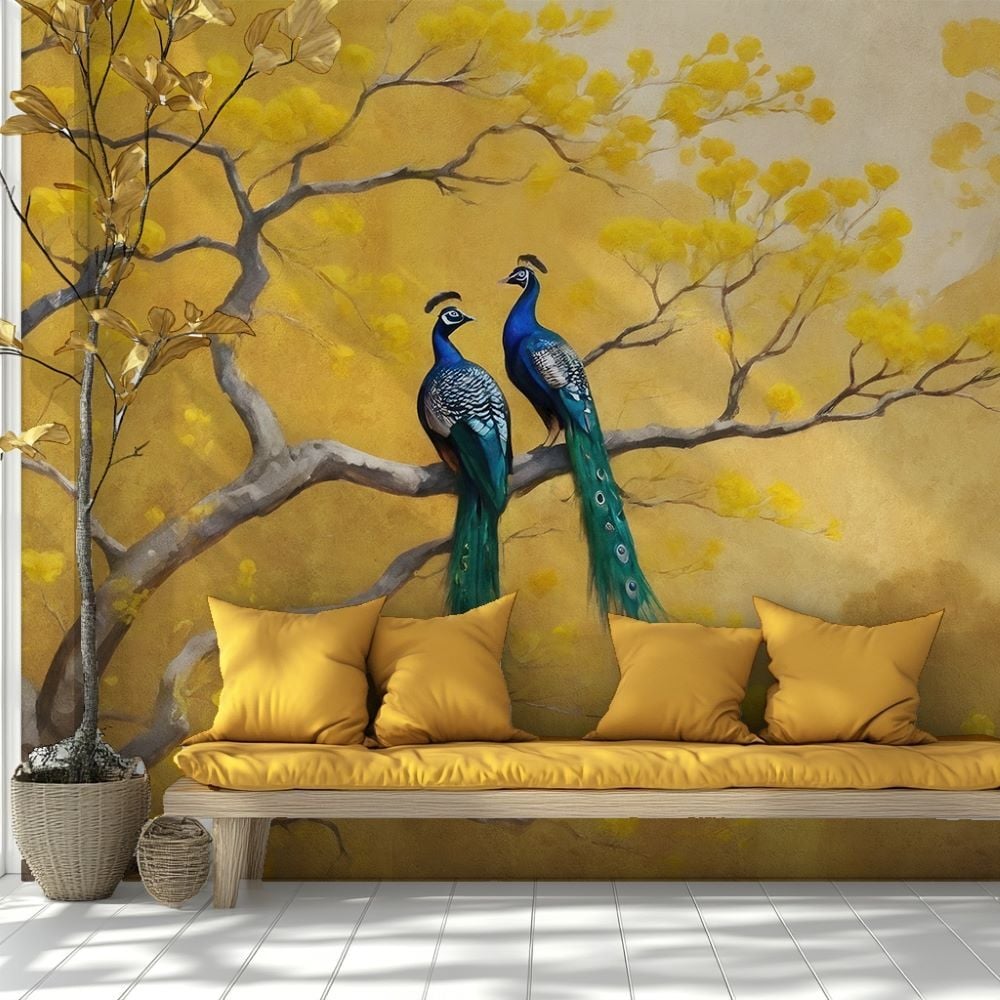 Altın Yapraklar Üstünde Zarif Tavus Kuşları Duvar Kağıdı