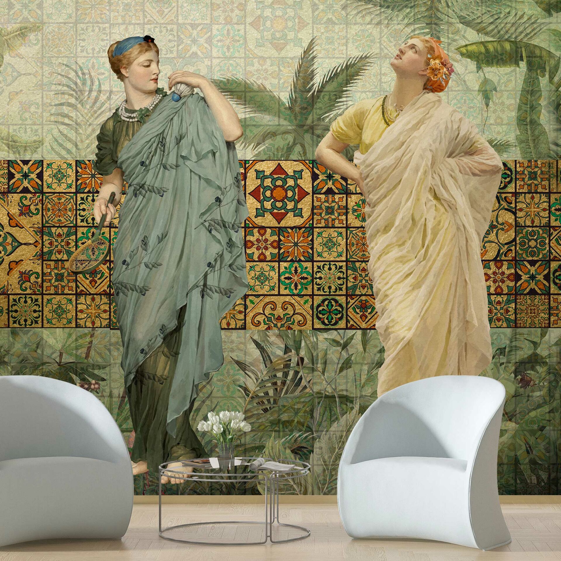 Antik Çağ Elbiseli Kadınlar ve Yapraklar Duvar Kağıdı