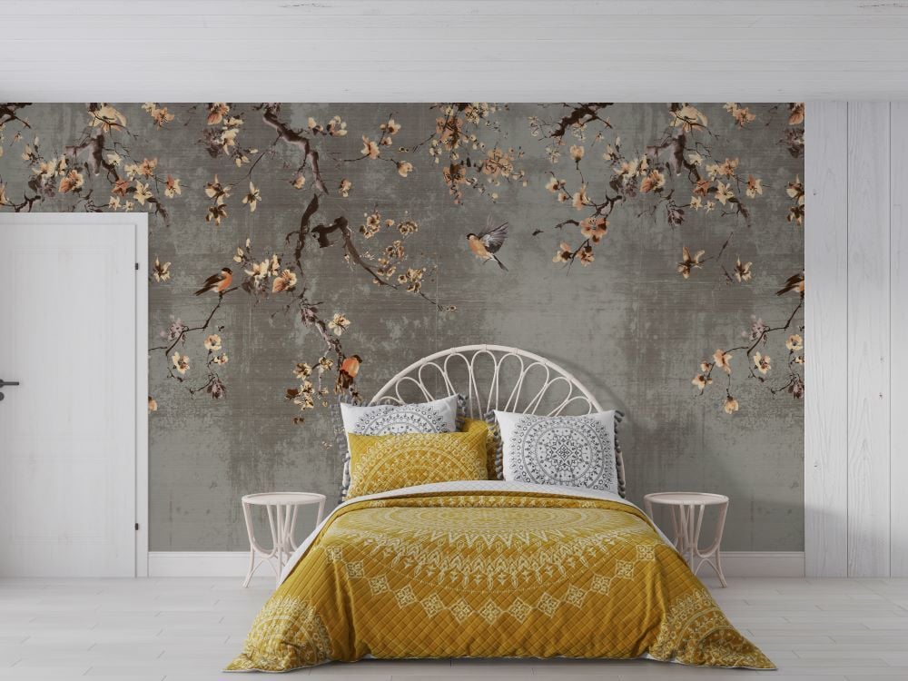 Antrasit Zeminde Serçe Kuşları Sarmaşık Duvar Kağıdı
