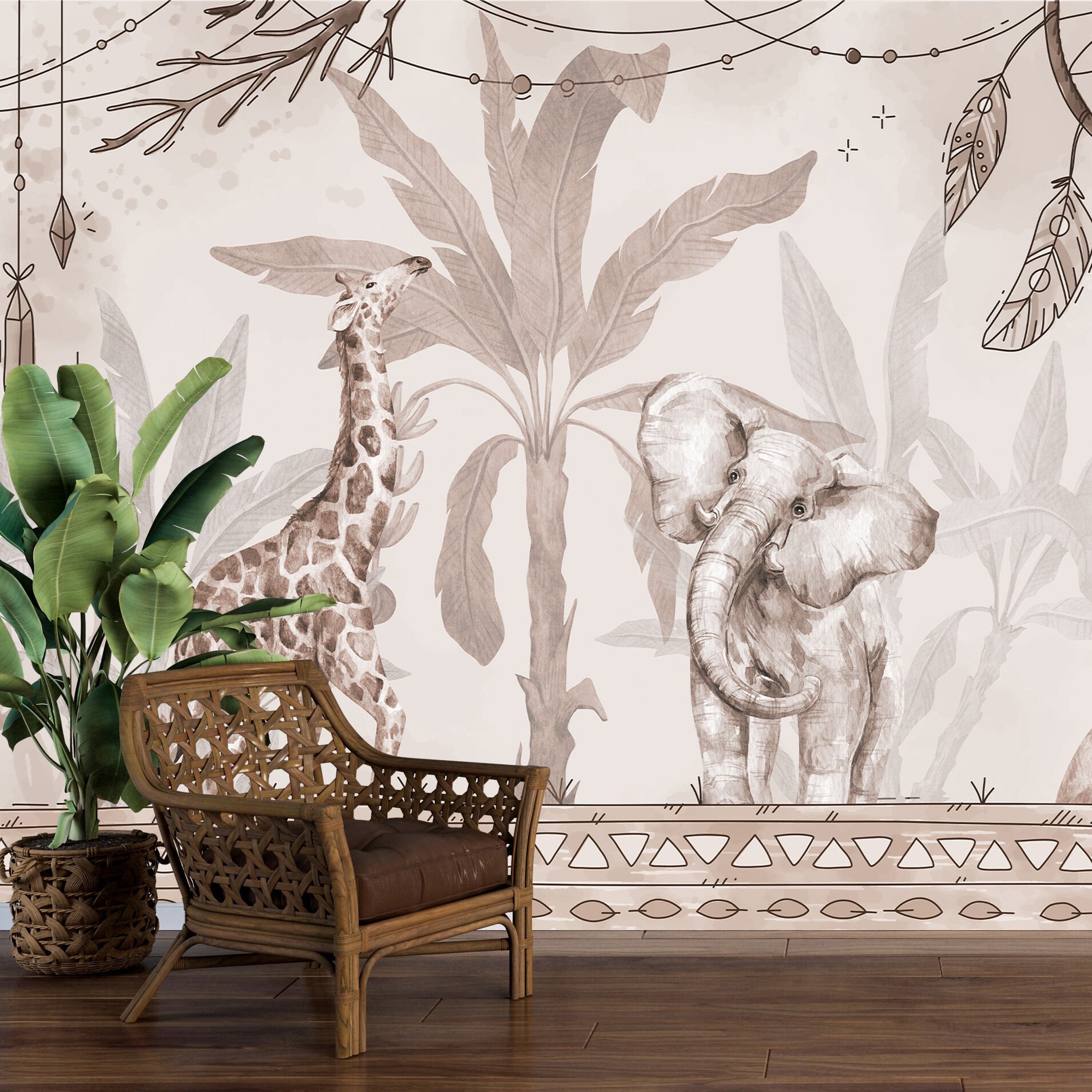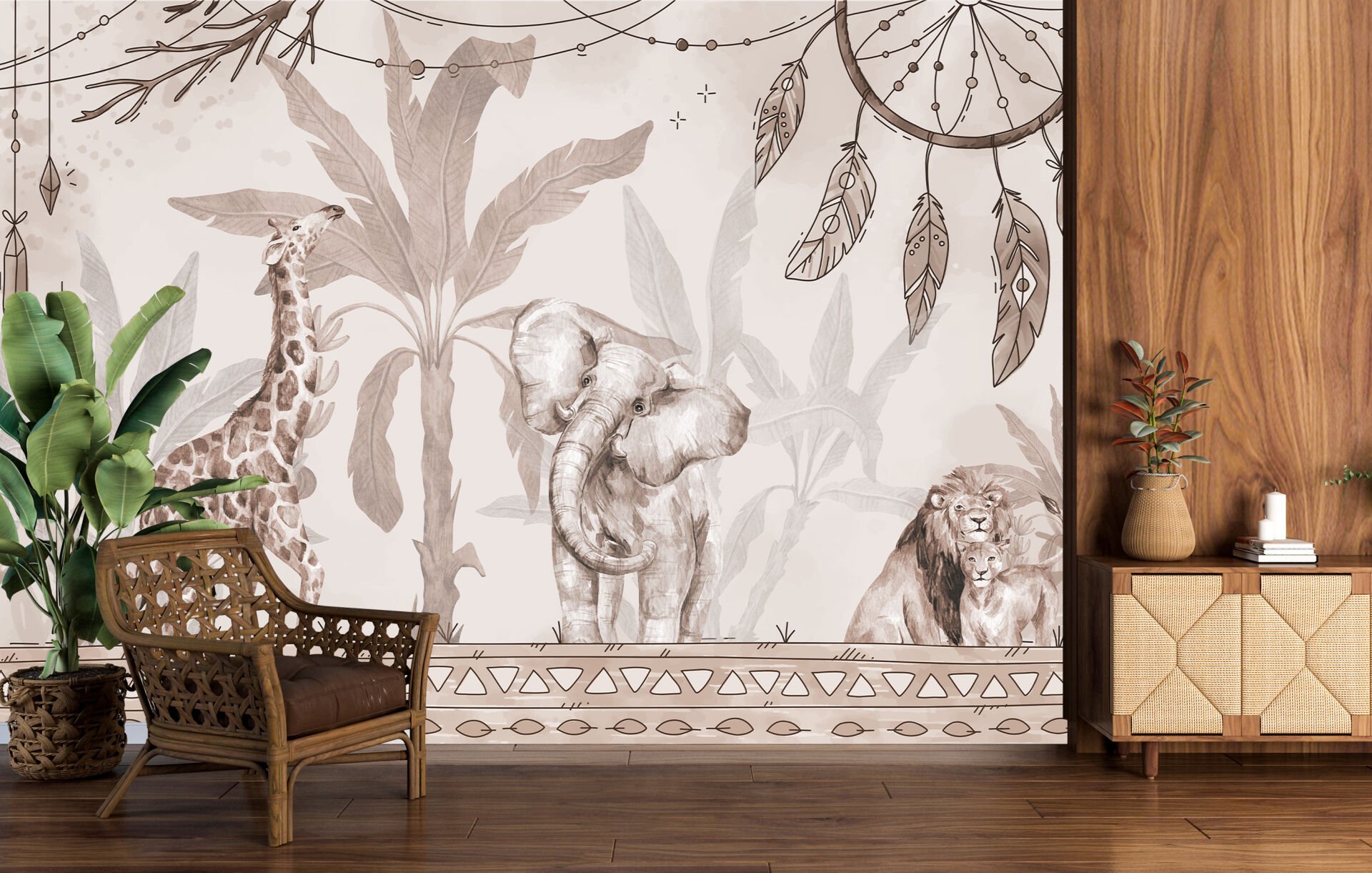 Aslan Ailesi Fil Zürafa Sepya Renk Duvar Kağıdı