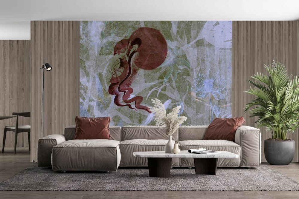 Ayın Üzerinde Bordo Kimonalı Kadın Duvar Kağıdı