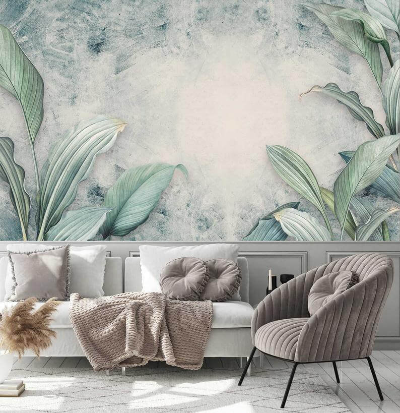 Botanik Açık Yeşil Yapraklar Bitki Tasarım Çiçekli Duvar Kağıdı