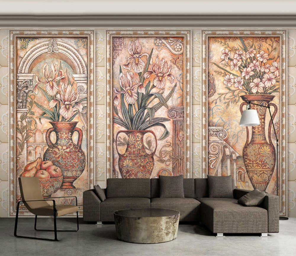 Çıtalar İçinde Etnik Vazolar Çiçekler Duvar Kağıdı