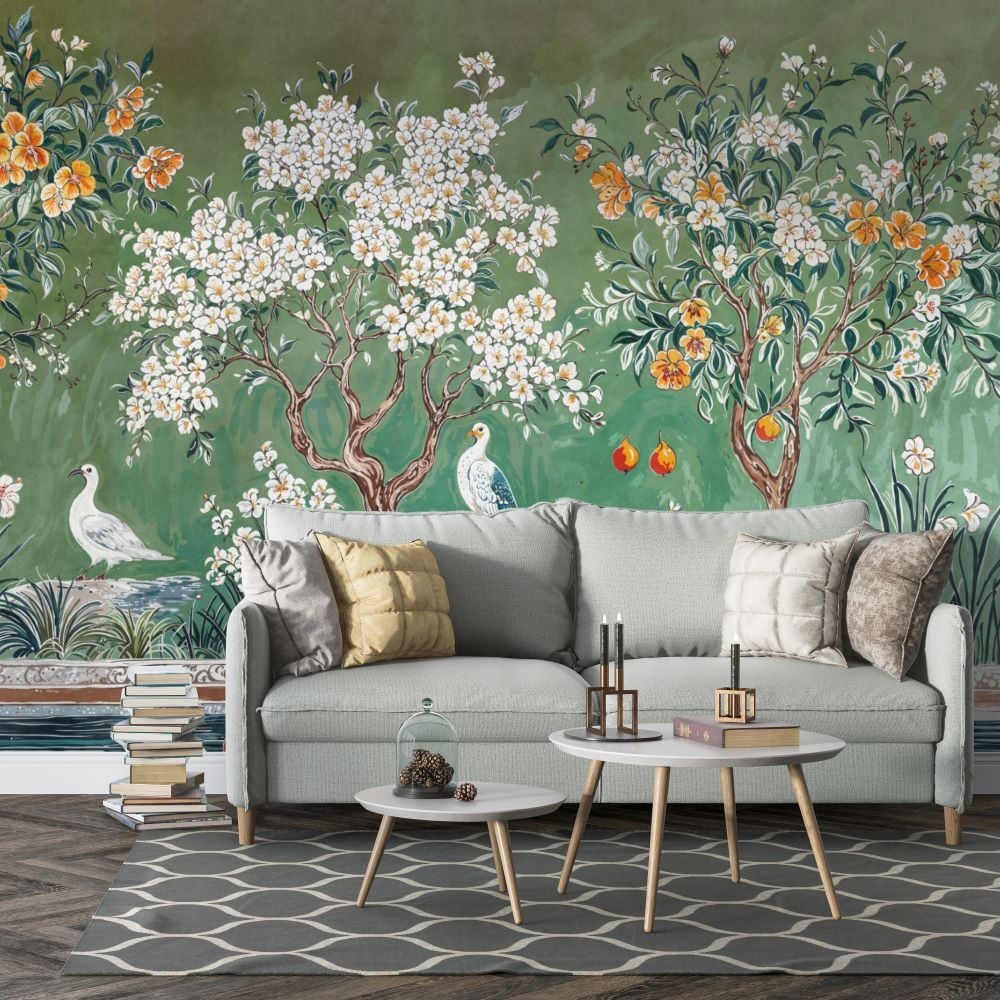 Çini Sanatından İlham Alan Modern Duvar Kağıdı.Doğayı Evinize Taşıyan Sanatsal Bir Dokunuş” “Yeşilin Huzuru, Kuşların Zarafetiyle Buluşuyor.