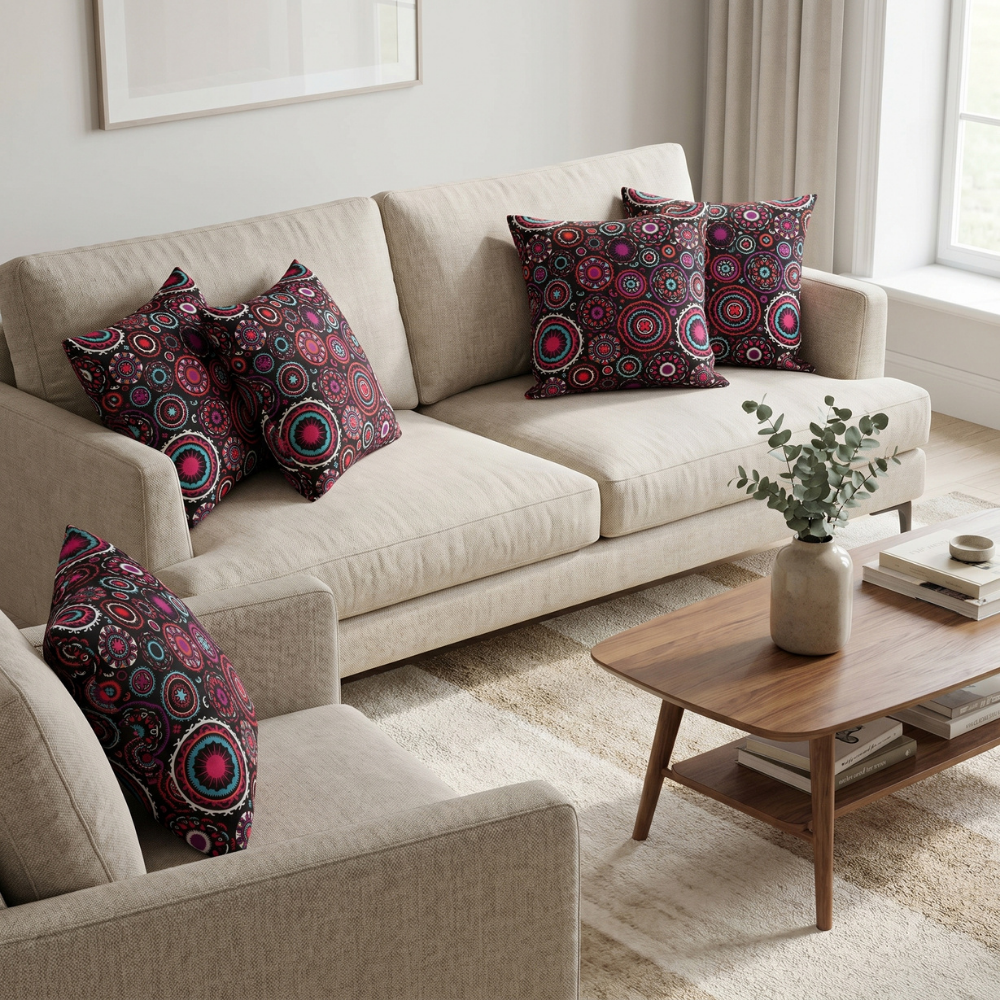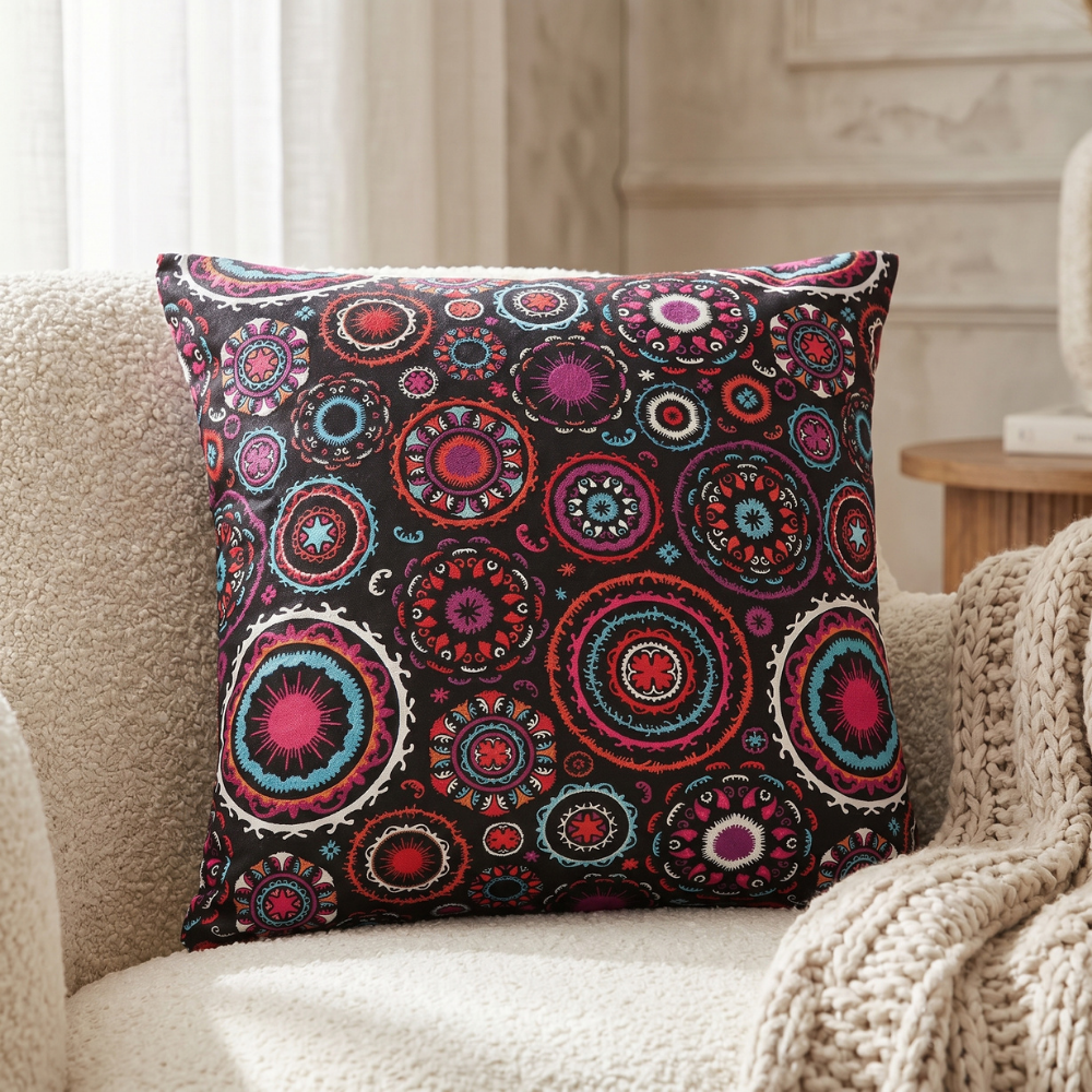Etnik motiflerin modern yorumuyla tasarlanan bu özel dekoratif yastık, yaşam alanlarına sanatsal ve özgün bir karakter kazandırır. Siyah zemin üzerinde öne çıkan canlı mandala desenleri sayesinde bu yastık, kırmızı, turkuaz, pembe ve mor tonlarıyla güçlü bir kontrast oluşturarak dikkat çekici bir görünüm sunar.