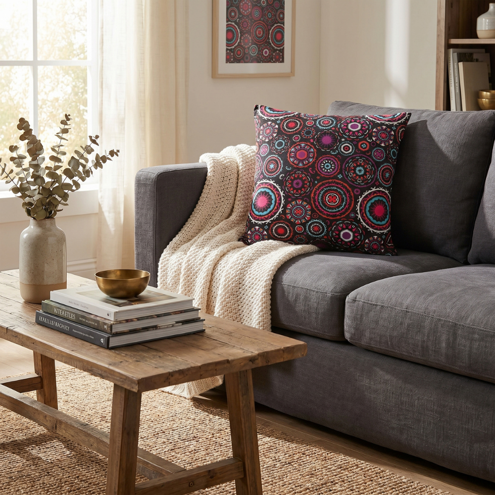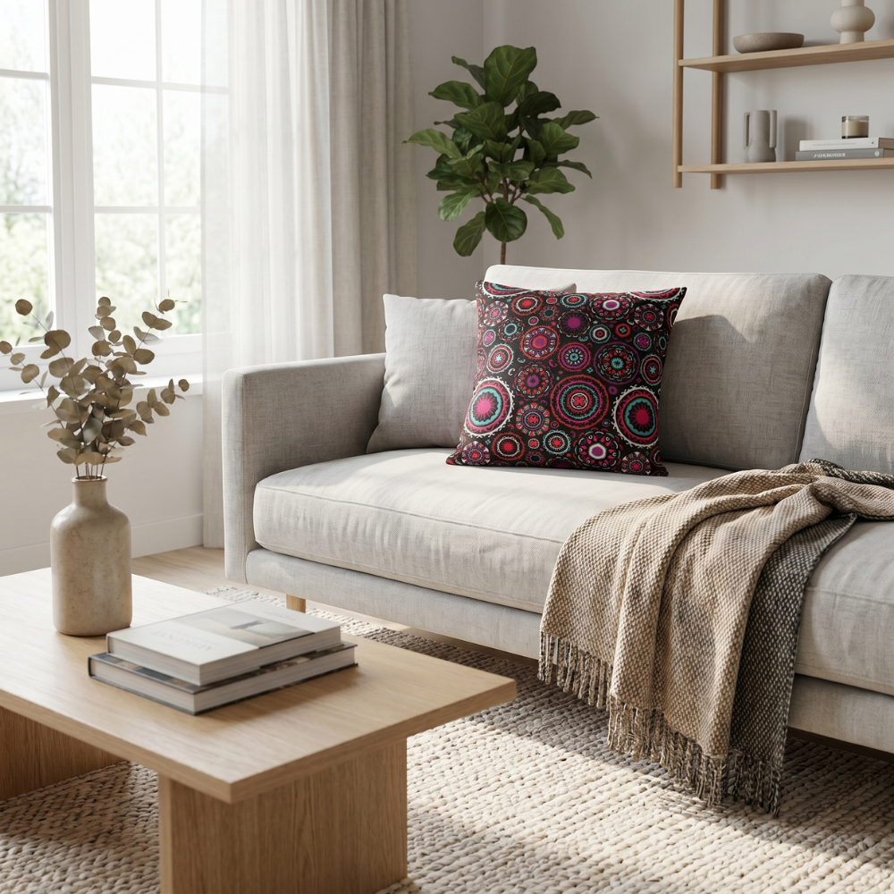 Mandala desenin dairesel ve simetrik yapısı ile etnik motiflerin zengin detayları birleşerek mekâna sanatsal ve bohem bir atmosfer kazandırır. Bu özel tasarım yastık, modern ve etnik dekorasyon stillerini bir araya getiren zamansız bir stil sunar.