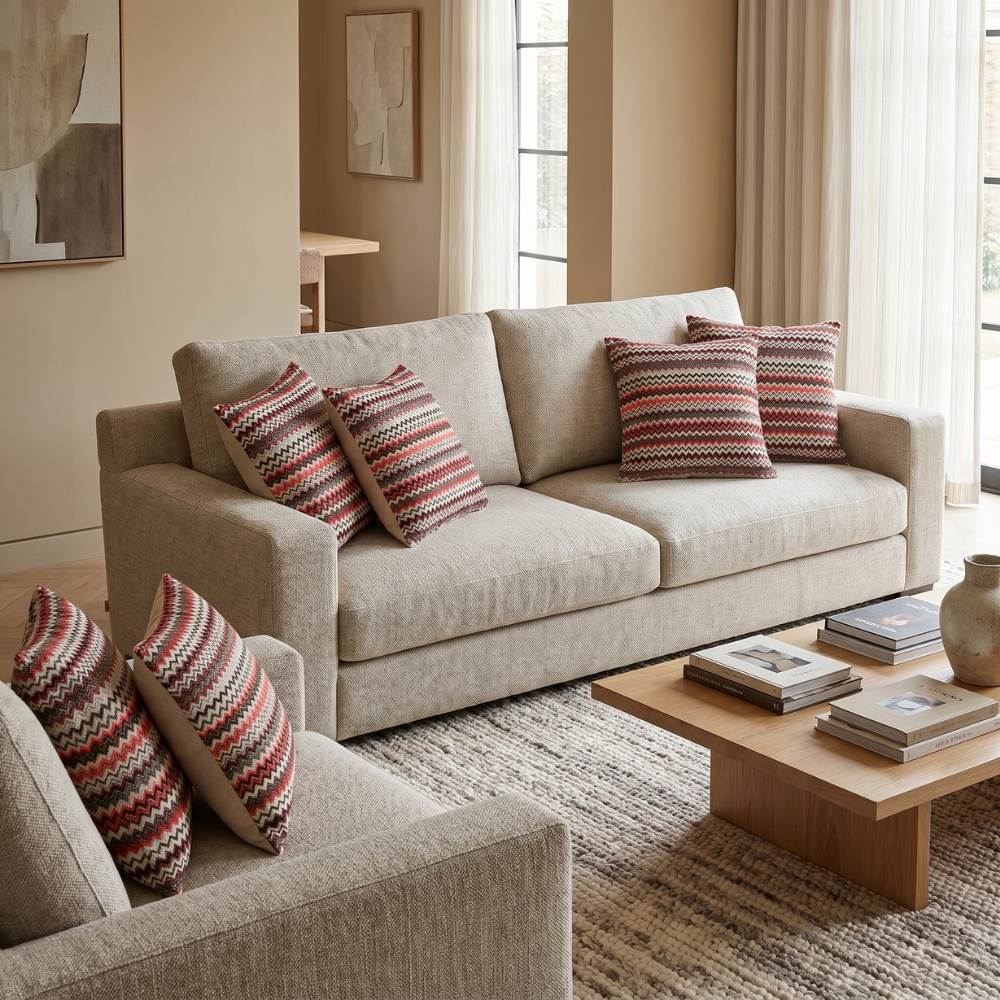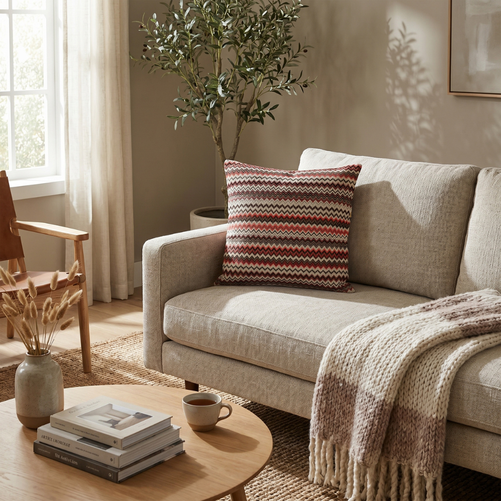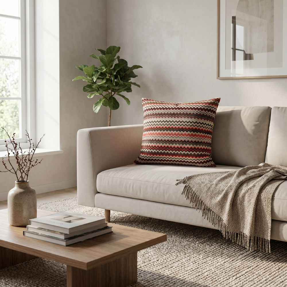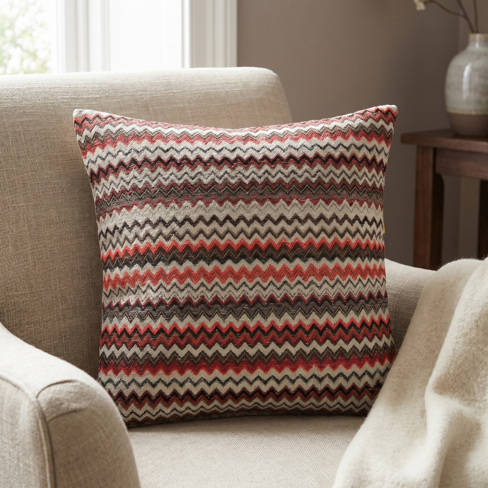 Doğal tonların sıcak kırmızı vurgularla buluştuğu bu özel tasarım dekoratif yastık, yaşam alanlarına samimi ve karakterli bir atmosfer kazandırır. Yatay formda ilerleyen zigzag desenler sayesinde bu yastık, yüzeyde ritmik bir akış oluştururken etnik dokunuşlarıyla mekâna özgün bir hava katar.