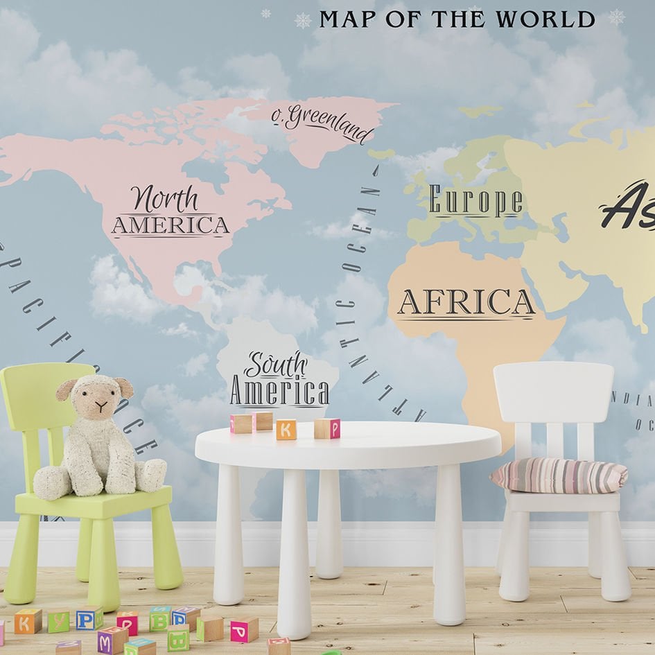Farklı Renkli Kıtalar Soyut Bulutlar Dünya Haritası Duvar Kağıdı