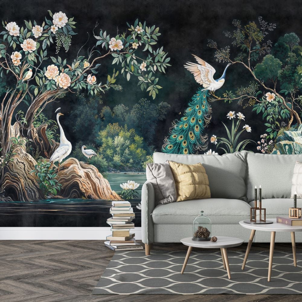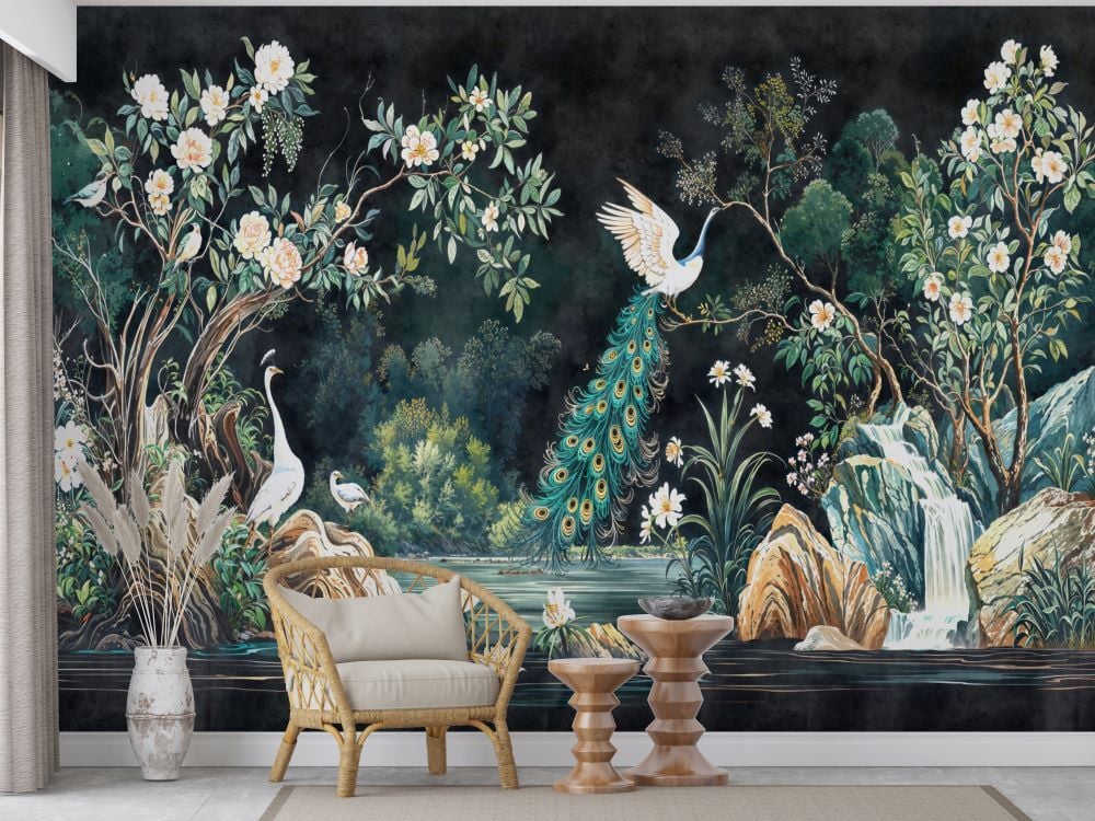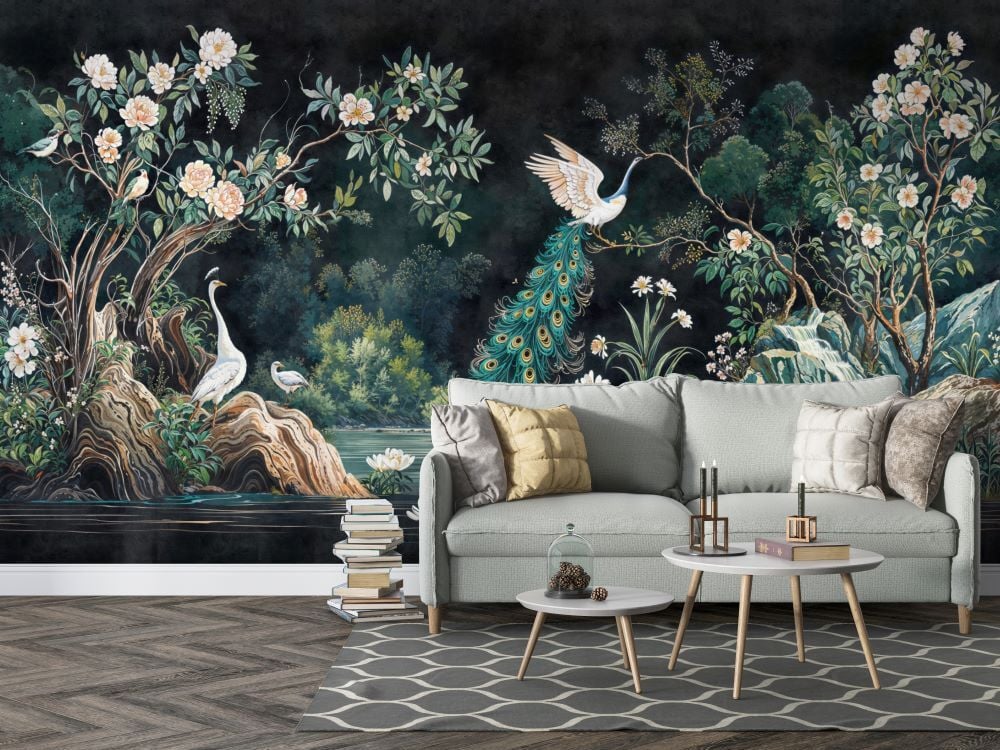 Gece Bahçesi Siyah Zeminli Tavus Kuşlu Duvar Kağıdı