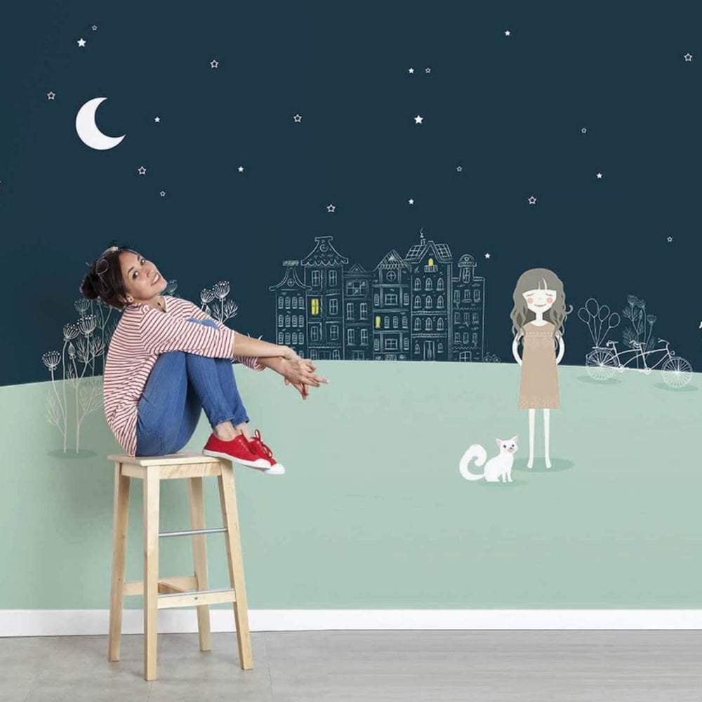 Gece Gökyüzü Küçük Hanım Ve Kedisi Duvar Kağıdı