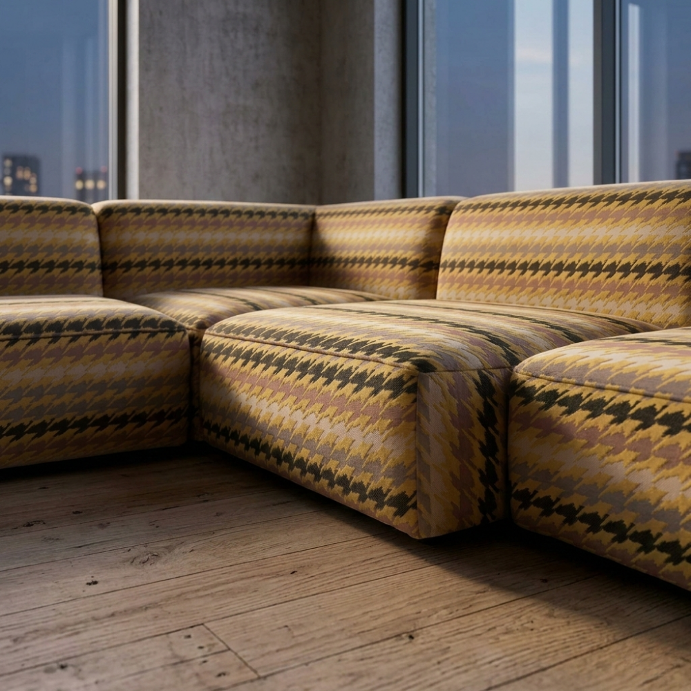 Geometrik çizgiler ile kaz ayağı deseninin modern kombinasyonunu bir araya getiren bu döşemelik kumaş, mekânlara güçlü ve dengeli bir karakter kazandırır. Zamansız desen yapısı sayesinde hem klasik hem de çağdaş dekorasyon stilleriyle uyum sağlar.