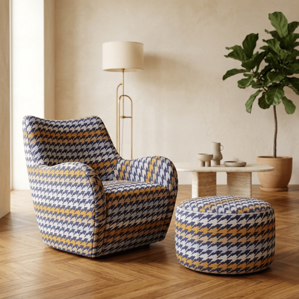 Geometrik çizgiler ile kaz ayağı deseninin dengeli kombinasyonunu bir araya getiren bu döşemelik kumaş, mekânlara modern ve karakterli bir atmosfer kazandırır. Desen yapısı sayesinde hem klasik hem de çağdaş dekorasyon stilleriyle uyum sağlar.