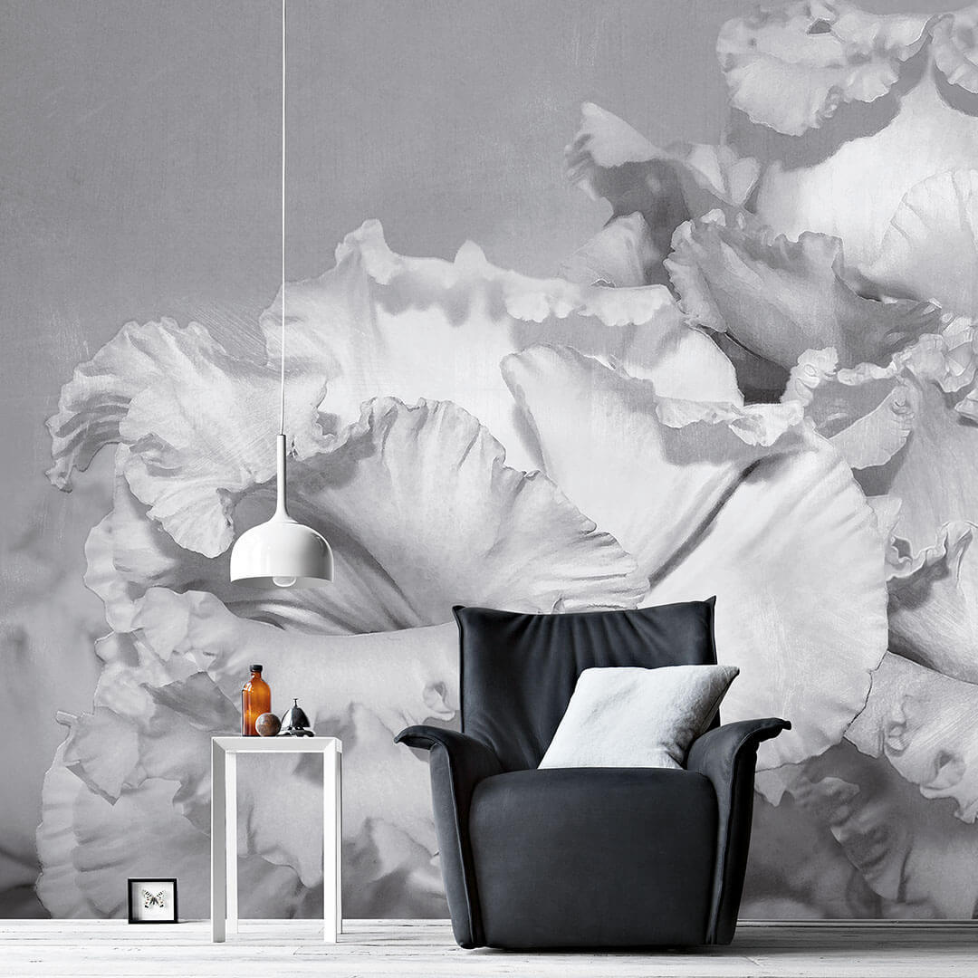 Gri Beyaz Büyük Yapraklı Beyaz Çiçek Duvar Kağıdı