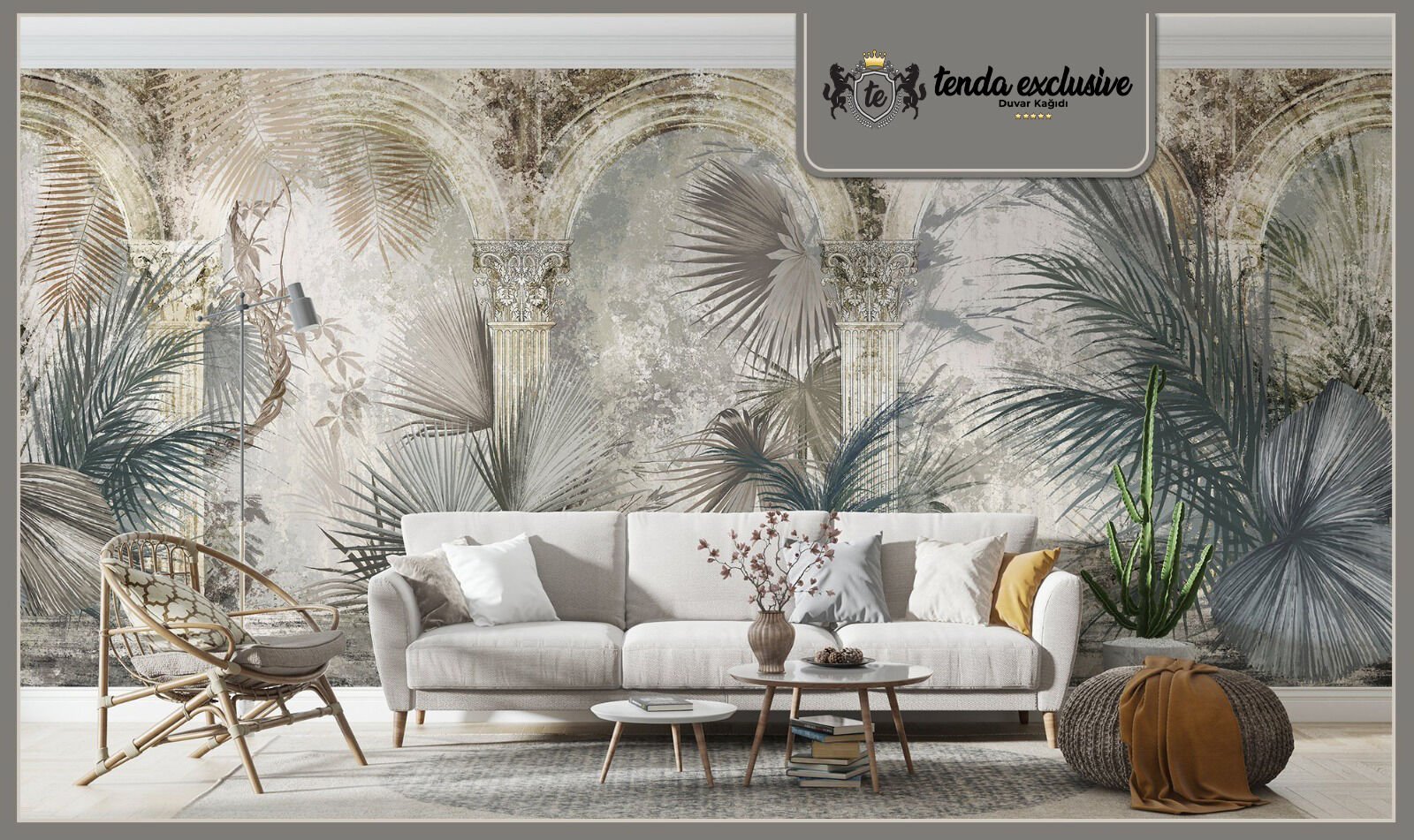 Gri Kahve Eskitme Sütunlar Tropik Yapraklar Duvar Kağıdı