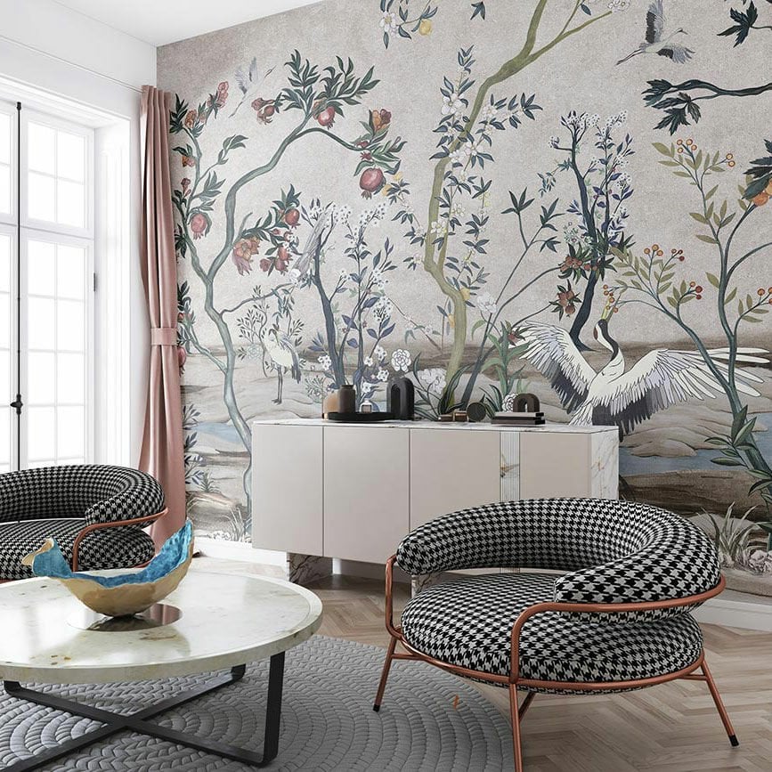 Gri Zeminde Nar Ağacı Turna Kuşları Duvar Kağıdı