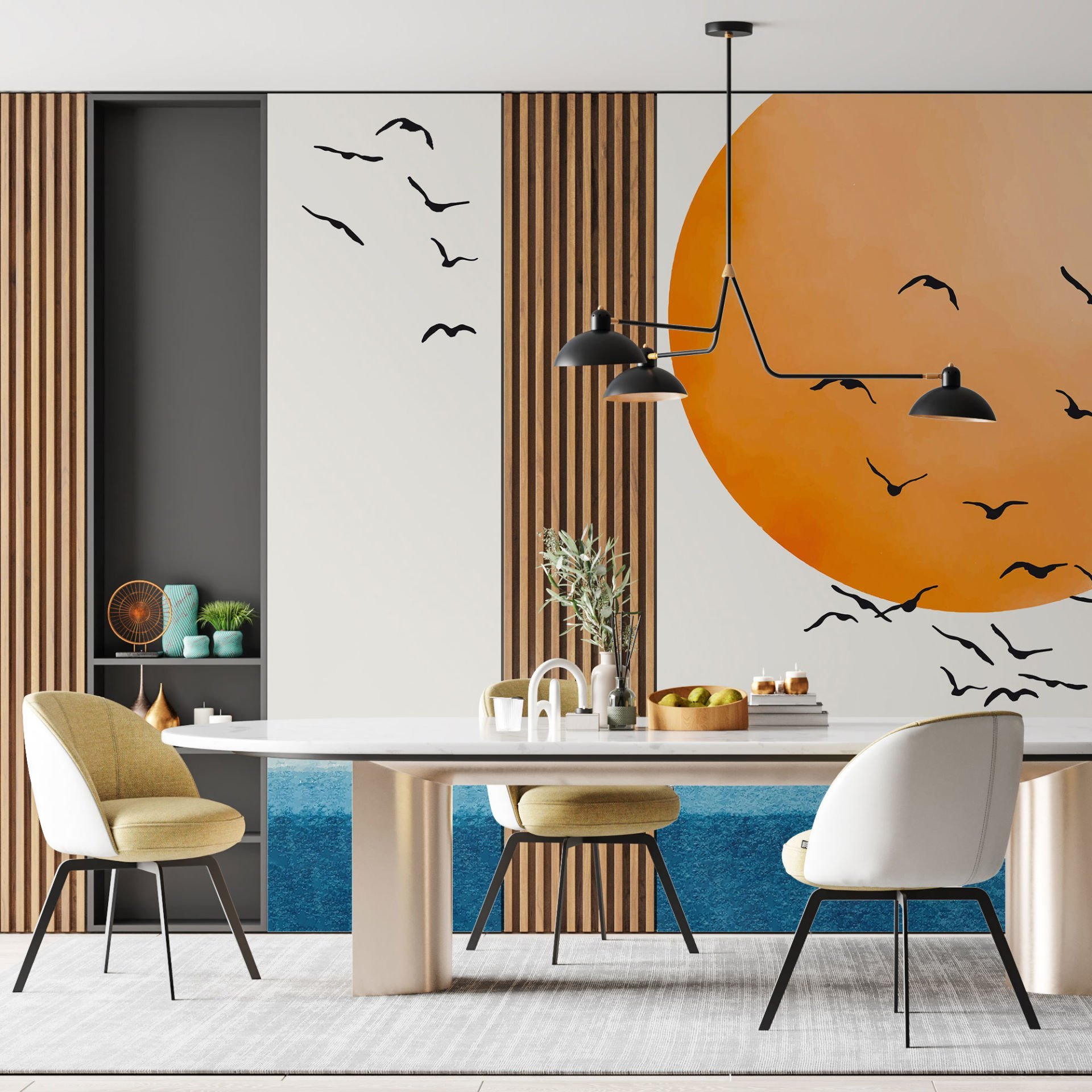 Gün Batımında Uçan Kuşlar ve Deniz Geometrik Duvar Kağıdı