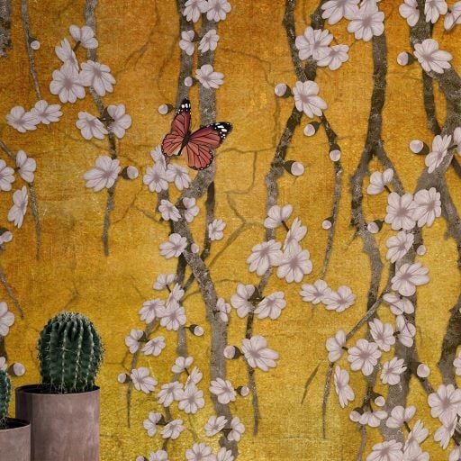 Hardal Zeminde Sarmaşık Çiçekler Duvar Kağıdı