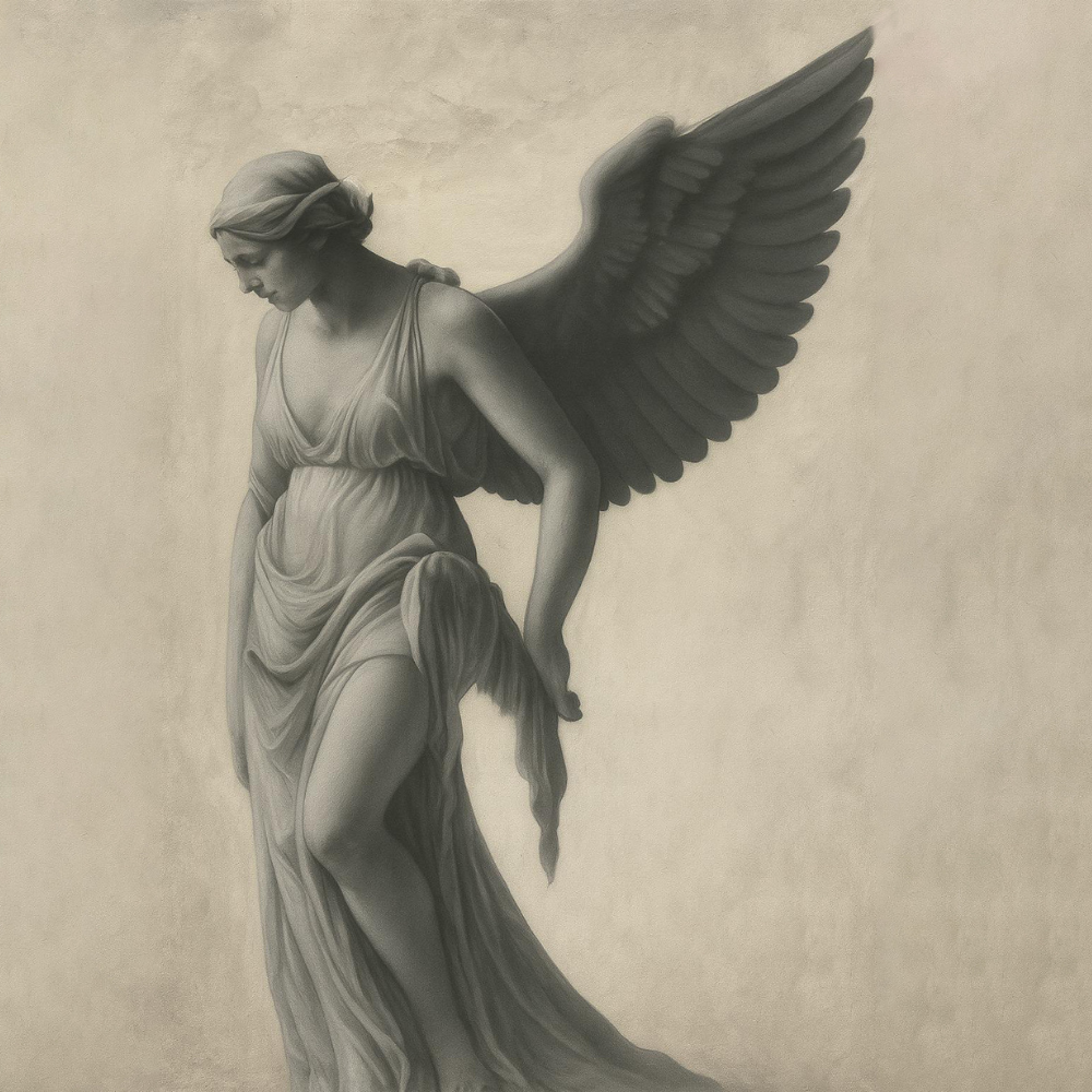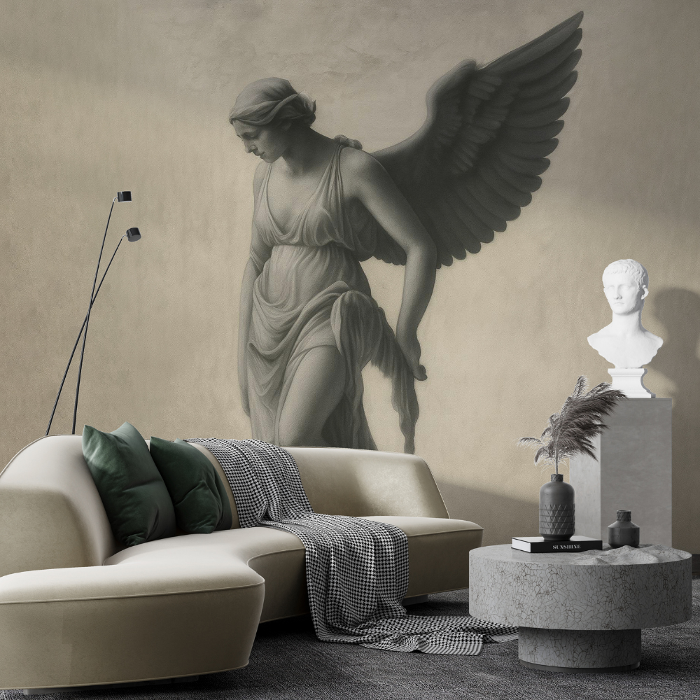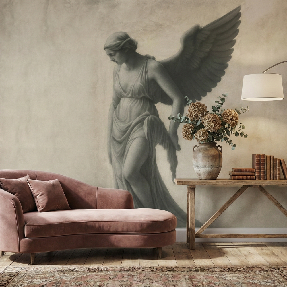 Kanatlı figürün dingin duruşu ve yumuşak gölge geçişleri, duvarda adeta üç boyutlu bir sanat eseri etkisi yaratır. Güçlü ama huzurlu… Asil ama abartısız…