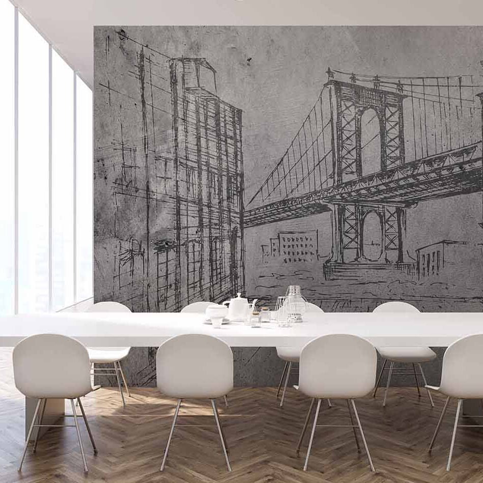 Karakalem Çizim Gri Zeminde Köprü Duvar Kağıdı