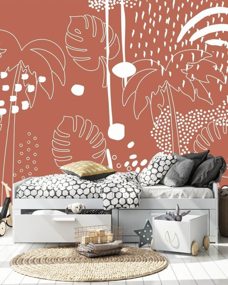 Kiremit Rengi Zeminde Beyaz Yaprak Çizimler Duvar Kağıdı