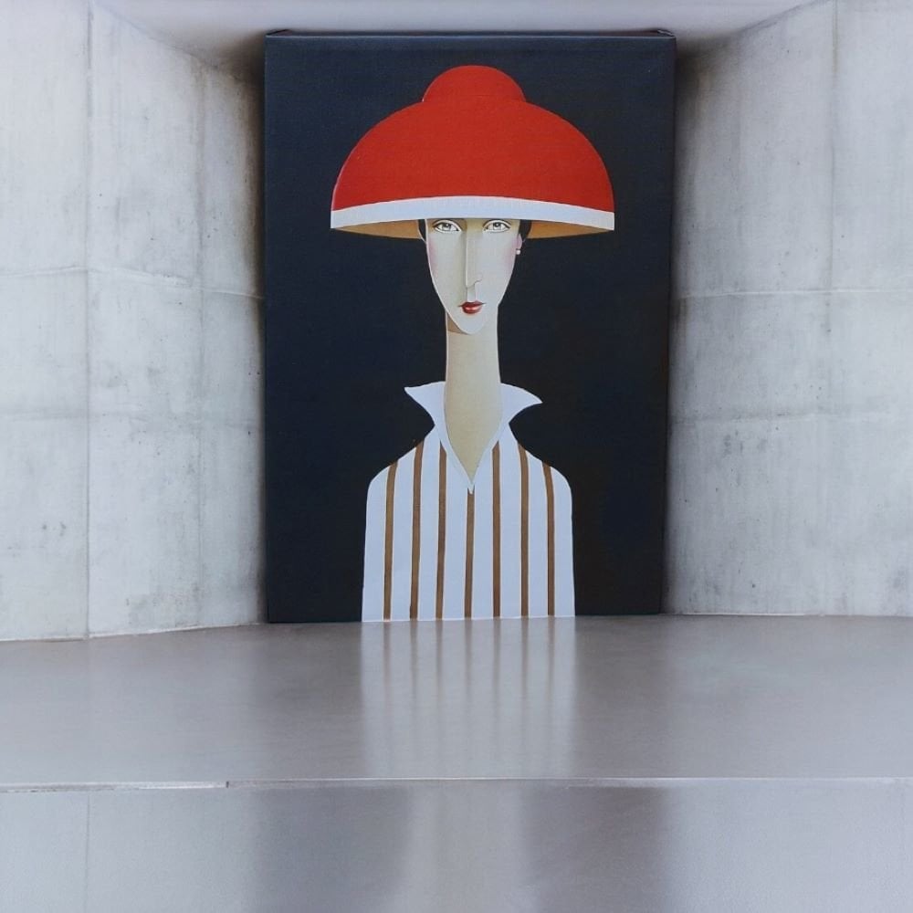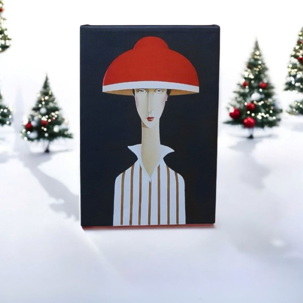Kırmızı Şapkalı Kenarı Beyaz Bordürlü Şapkalı Kadın