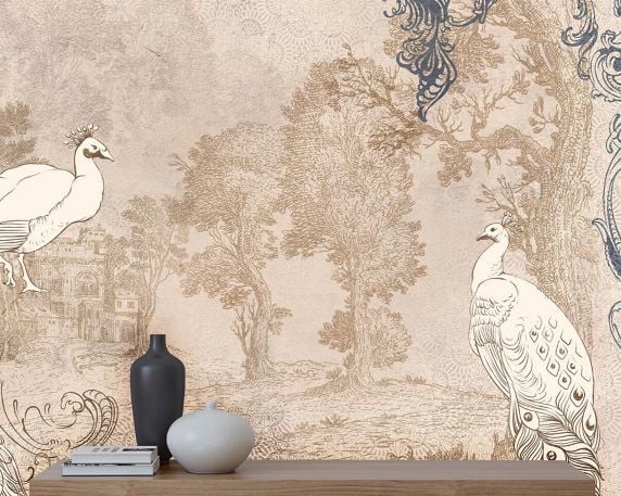 Klasik Eskitme Duvarda Tavuskuşları Duvar Kağıdı