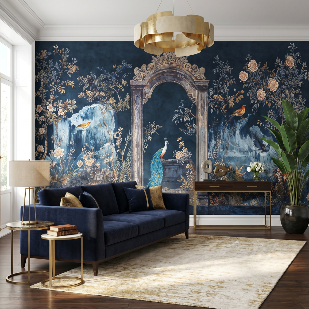 Kraliyet Bahçesi Tavuskuşu Manzara Duvar Kağıdı, klasik mimarinin zarafeti ile doğanın büyüleyici detaylarını bir araya getiren eşsiz bir tasarımdır. Derin lacivert zemin üzerinde konumlanan taş kemer formu, mekâna tarihsel ve sanatsal bir atmosfer kazandırırken tavuskuşu figürü kompozisyonun merkezinde güçlü bir odak noktası oluşturur.