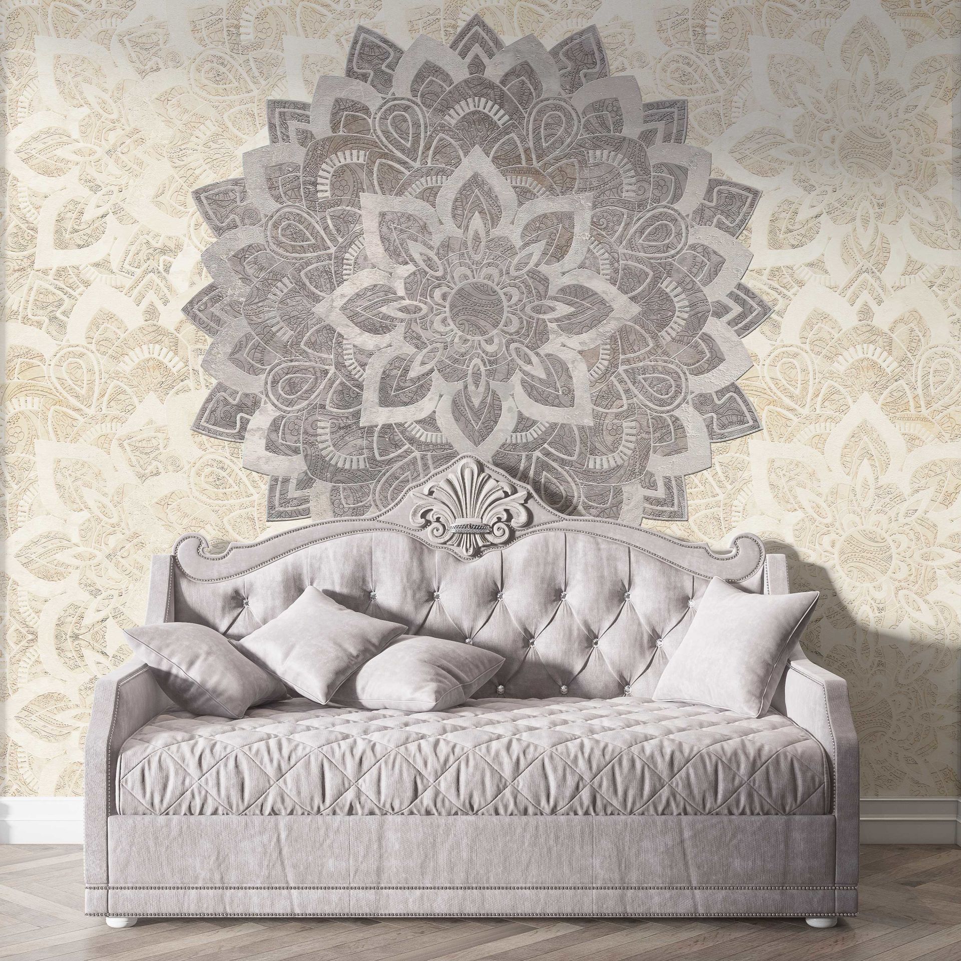 Krem Mandala Üzerinde Gri Yaşam Çiçeği Desen Duvar Kağıdı