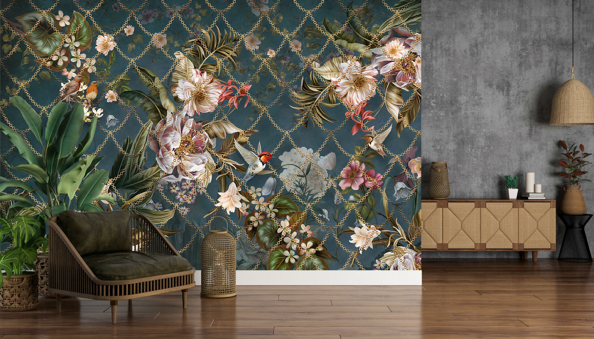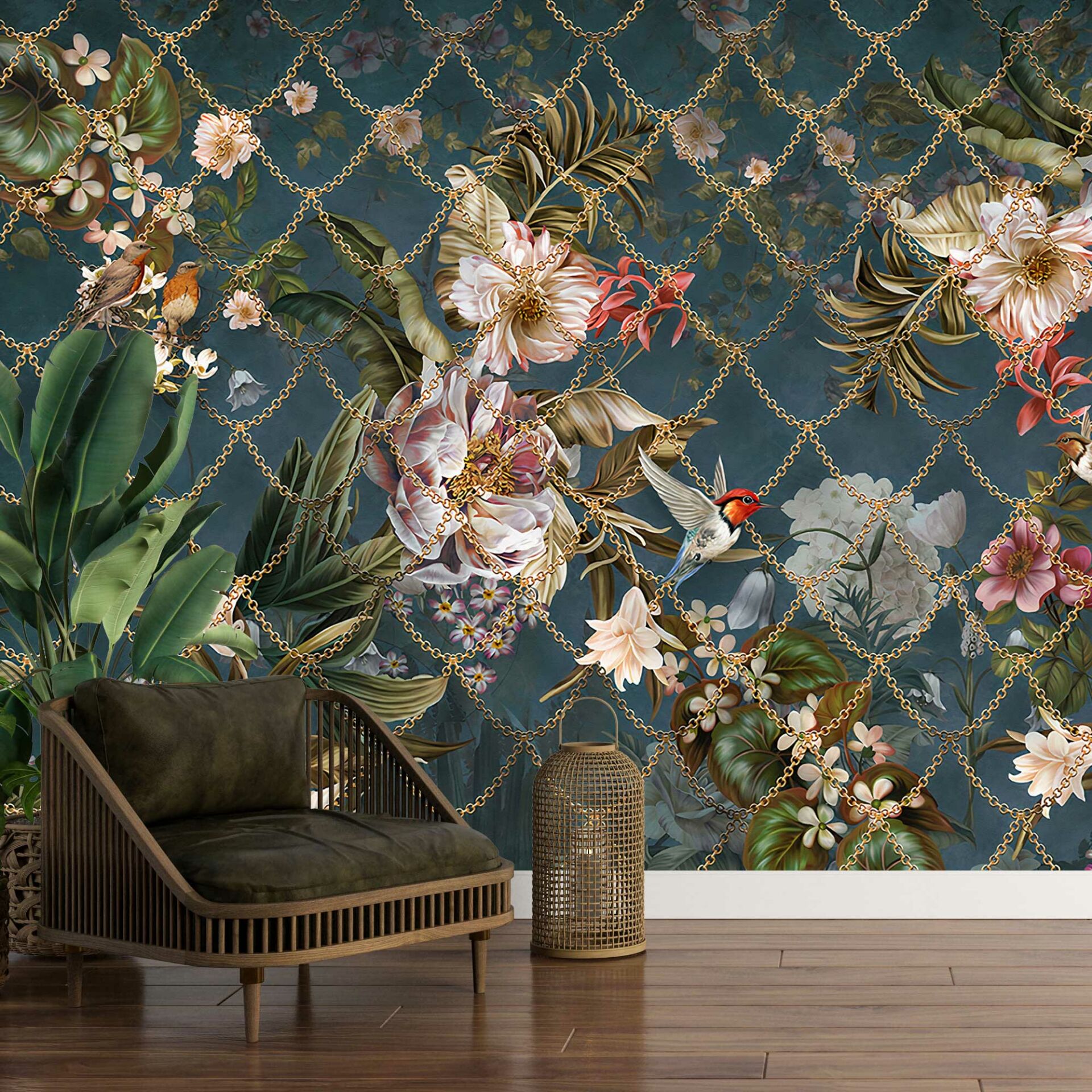 Manolya Çiçekleri Minik Kuşlar Altın Zincir Detaylı Duvar Kağıdı