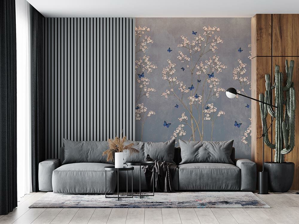 Mavi Kelebekler Çiçekler Duvar Kağıdı