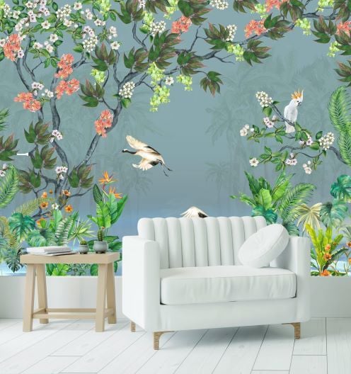 Mavi Zeminde Turna Kuşu Sakura Çiçekler Duvar Kağıdı