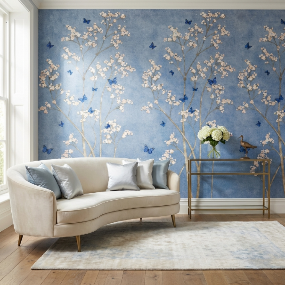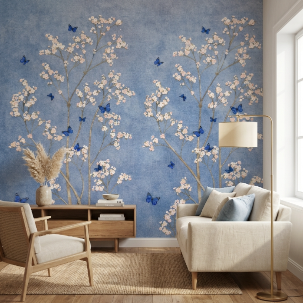 Bu tasarım, baharın en sade ve zarif anlarından ilham alır. Soft mavi zemin üzerinde yükselen ince dal formları, beyaz çiçeklerin naif dokunuşu ve kelebeklerin hafif hareketi ile mekâna dingin bir estetik kazandırır. Gün ışığında canlı ve ferah, akşam ışığında ise daha yumuşak ve huzurlu bir atmosfer sunar. Zamansız ve sade şıklık arayanlar için özel olarak tasarlanmıştır.
