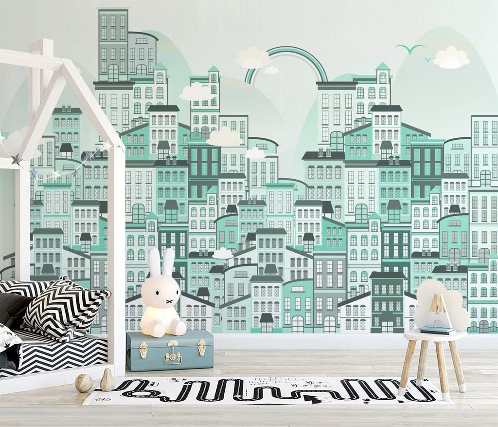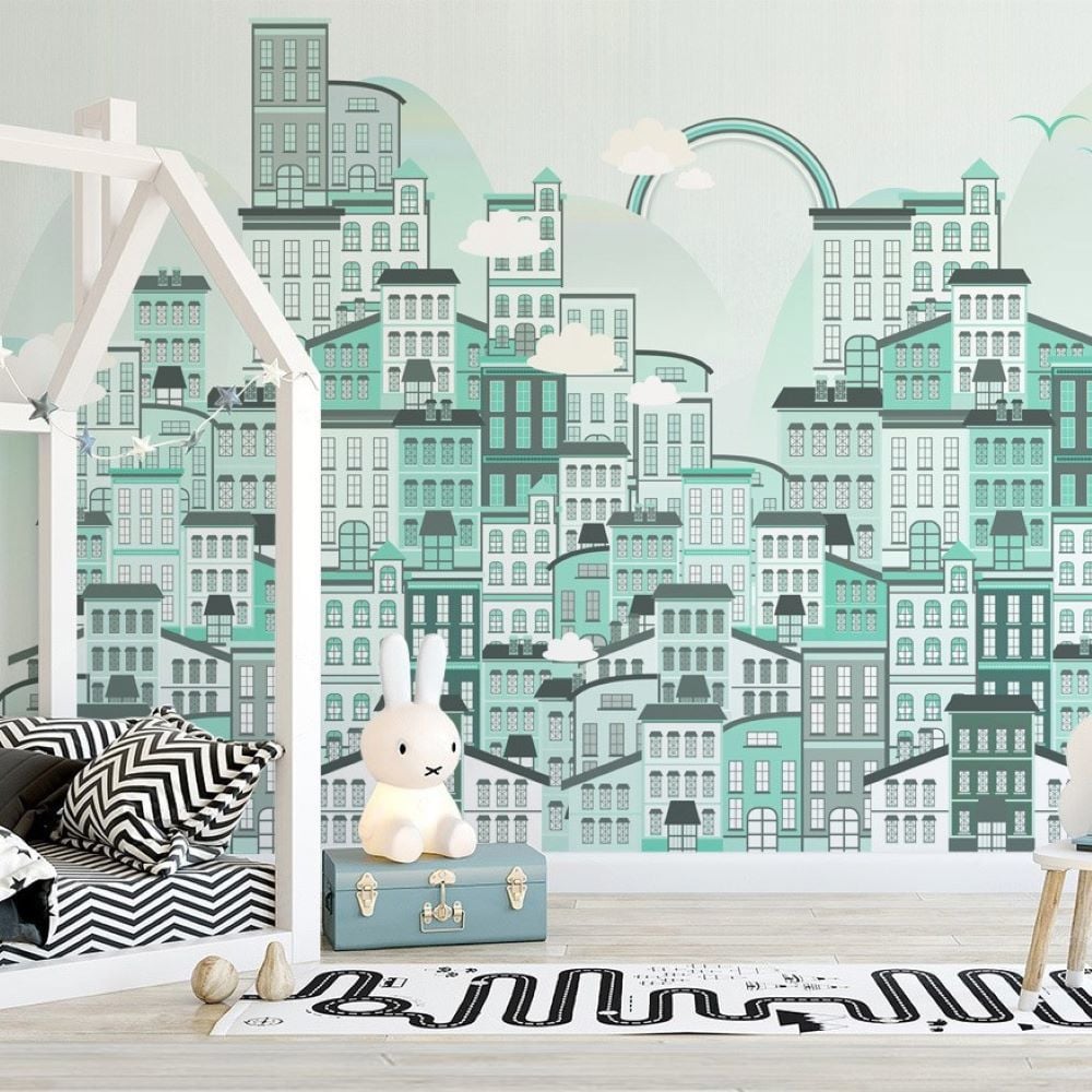 Mint Yeşili Gökkuşağı Binalar Şehir Duvar Kağıdı