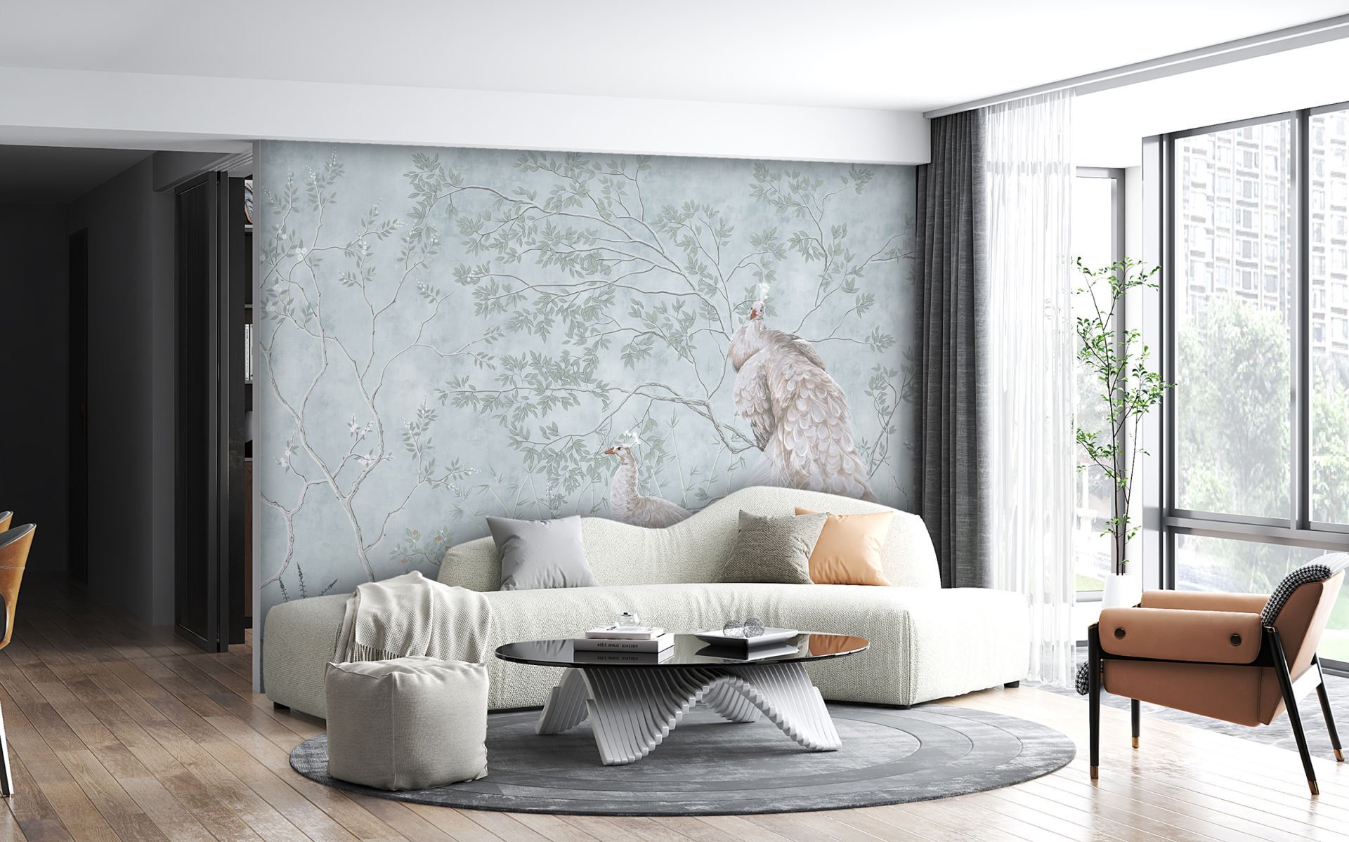 Mint Zeminde Beyaz Tavuskuşları Tasarım Duvar Kağıdı Özellikleri