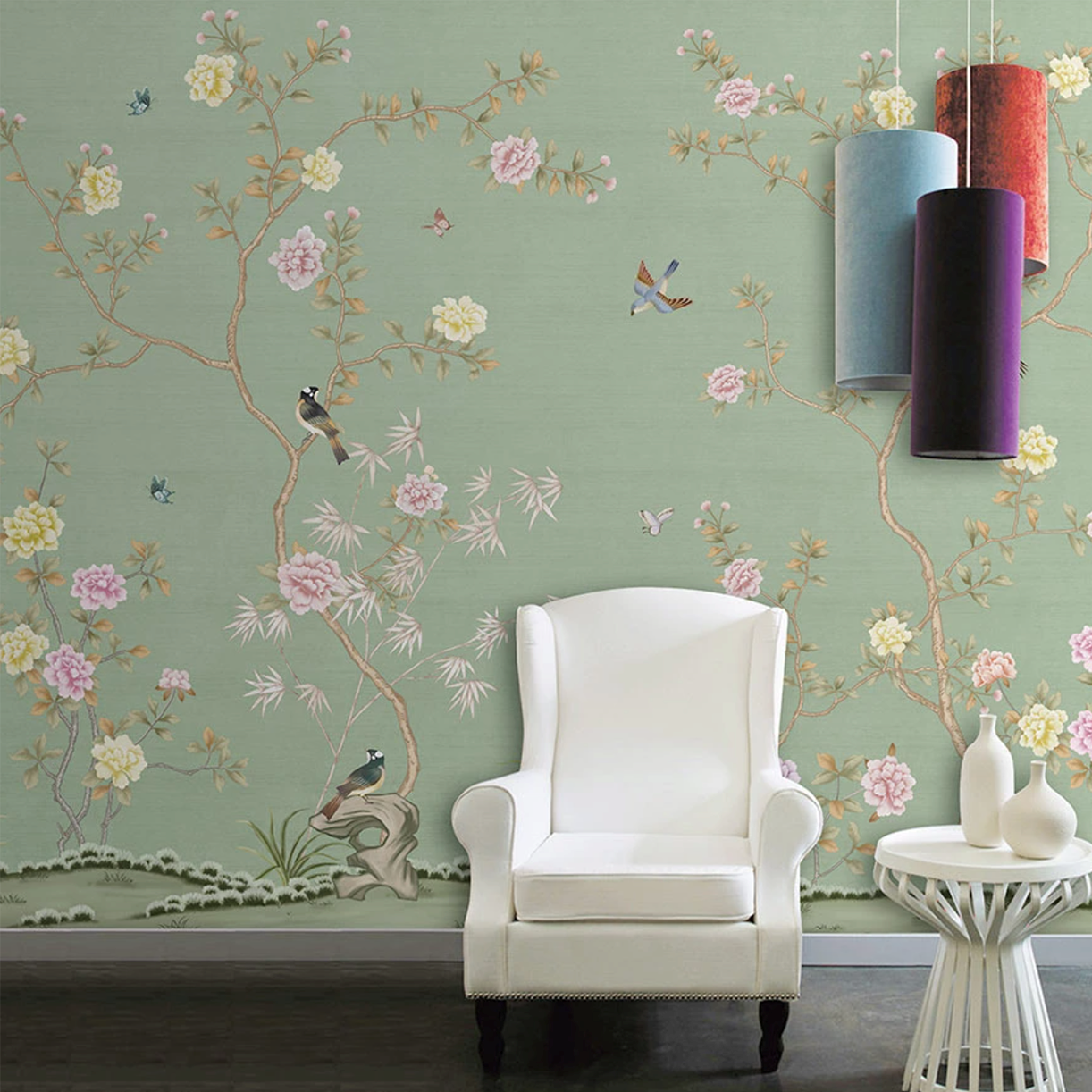 Mint Zeminde Çin Gülü Ve Kırlangıçlar Duvar Kağıdı