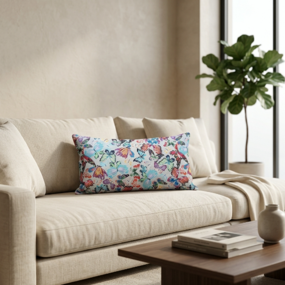Kelebek motiflerinin zarif ve doğal estetiğini yansıtan bu özel tasarım yastık, yaşam alanlarına hafif ve huzurlu bir atmosfer kazandırır. Desen detaylarındaki ince işçilik sayesinde bu dekoratif bel yastığı, mekâna romantik ve estetik bir dokunuş katar.