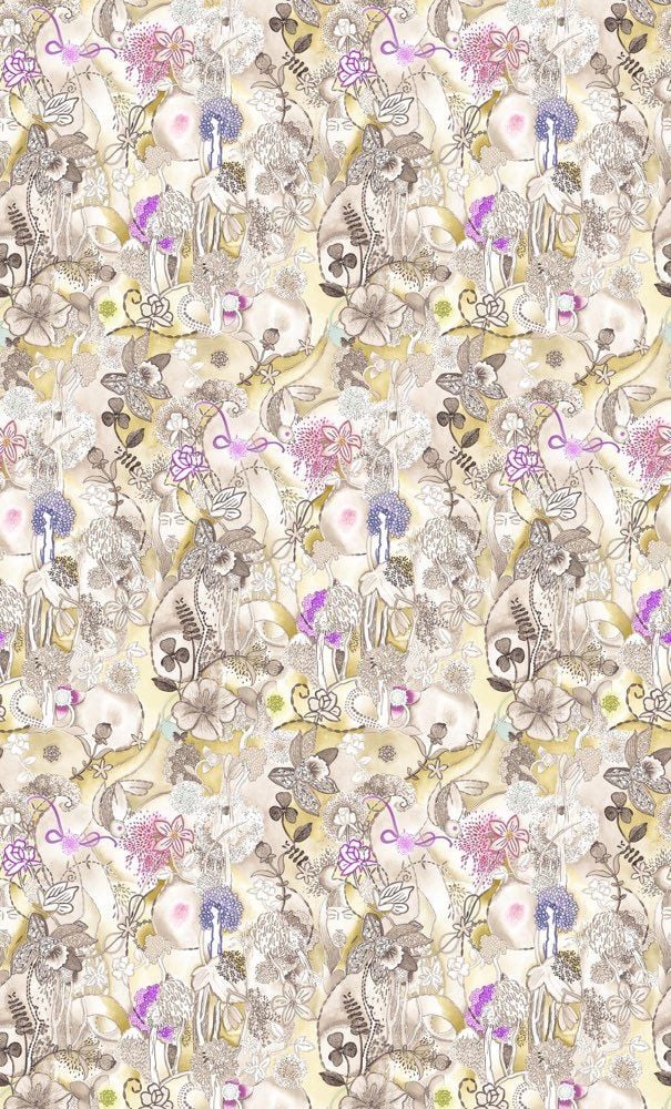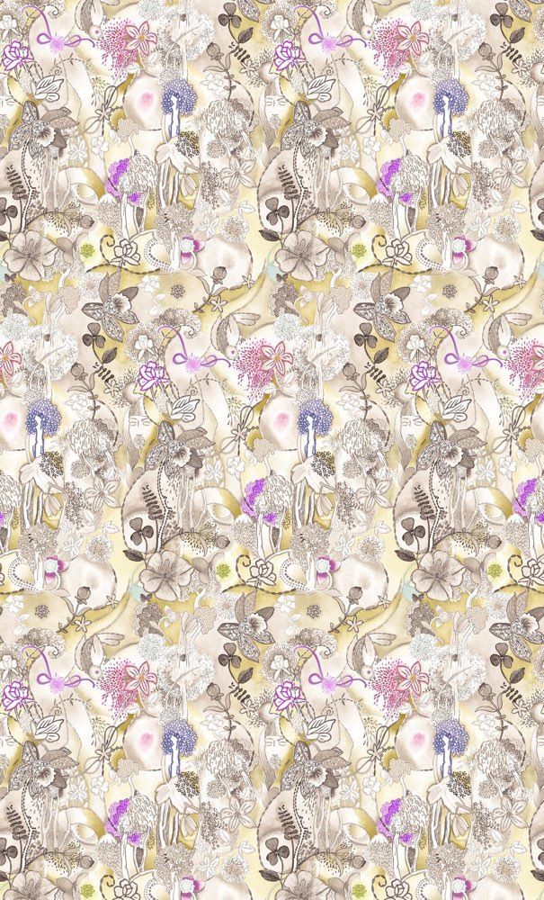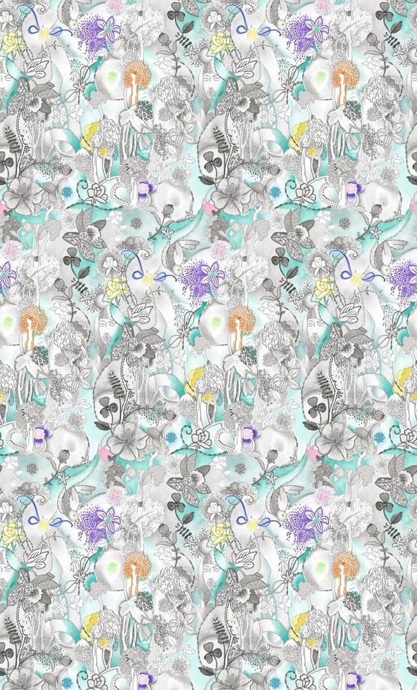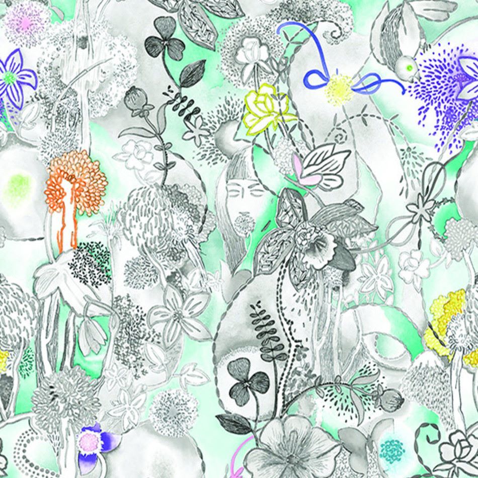Yeşil, sarı, turuncu, mor detayların yanı sıra siyah-beyaz fonlu, grafit tanecikli, hayal gücünü hatırlatan büyük desen;