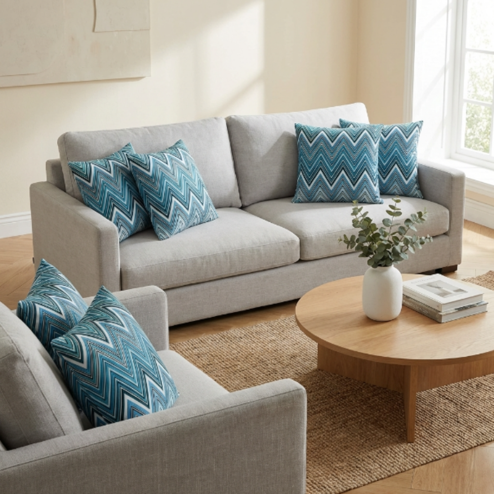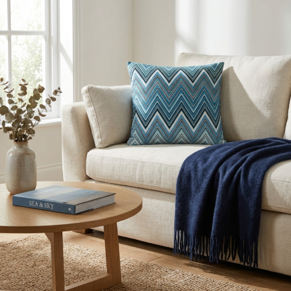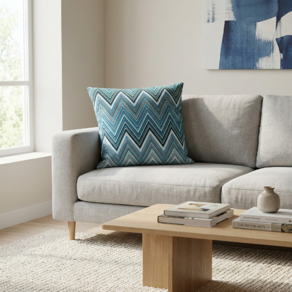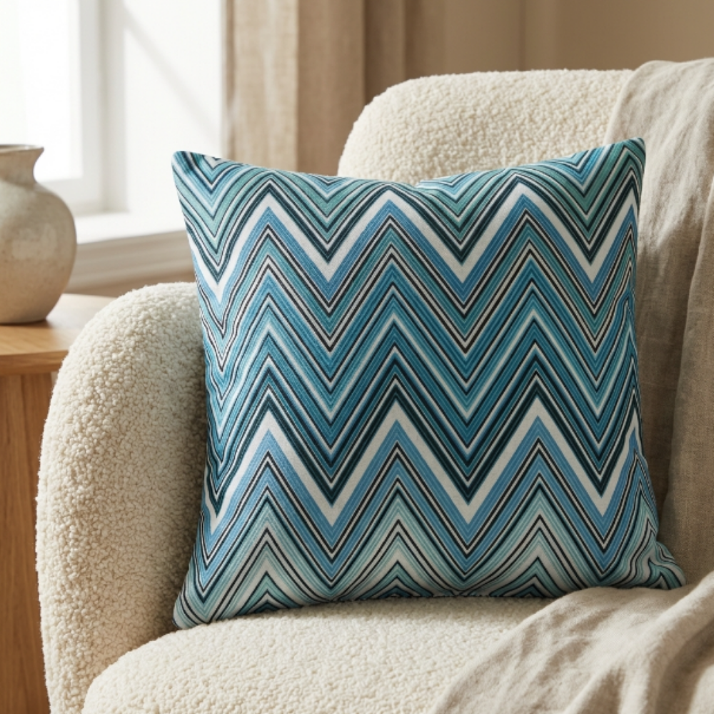 Zigzag desenin dalgalı geometrik akışı ile okyanus tonlarının derinliği birleşerek mekâna modern ve enerjik bir atmosfer kazandırır. Bu özel tasarım yastık, contemporary dekorasyon anlayışını güçlü renk geçişleriyle buluşturan zamansız bir stil sunar.