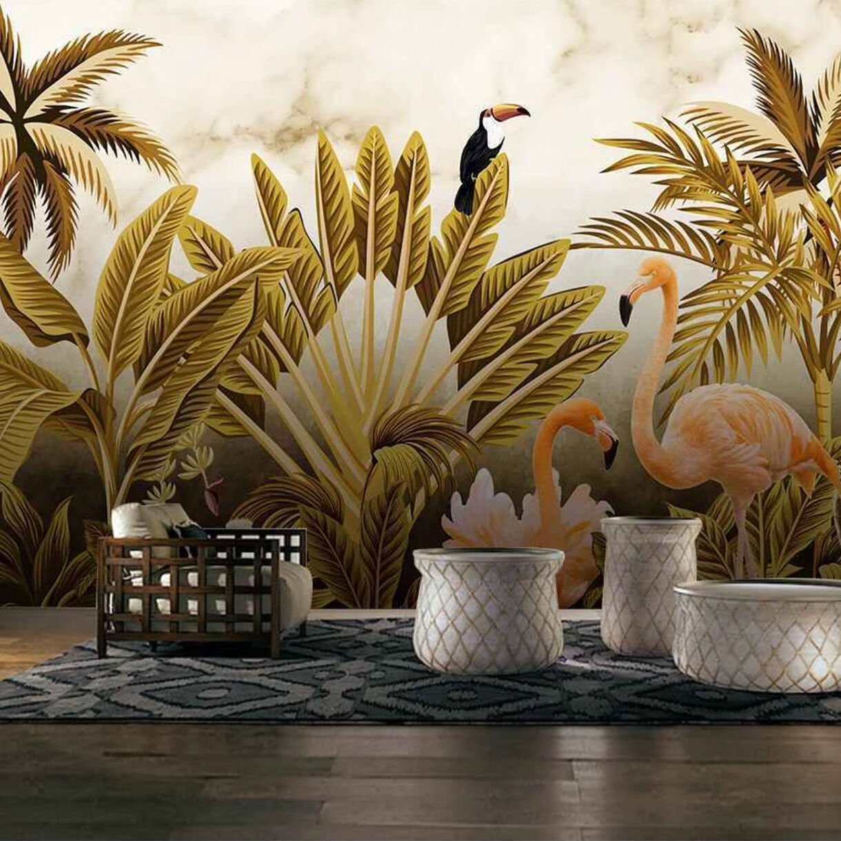 Ormanda Flamingolar Ağaçlar Duvar Kağıdı