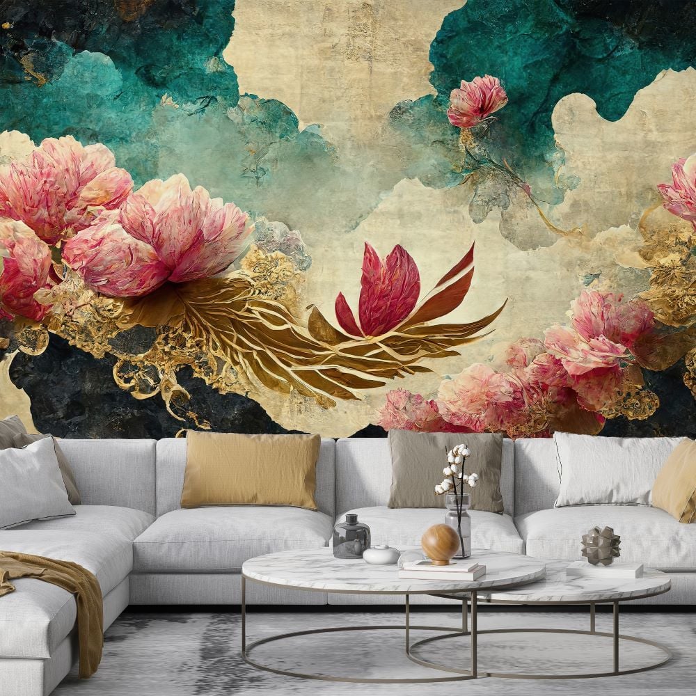 Ortanca Çiçekler Gold Yapraklar Tasarım Duvar Kağıdı