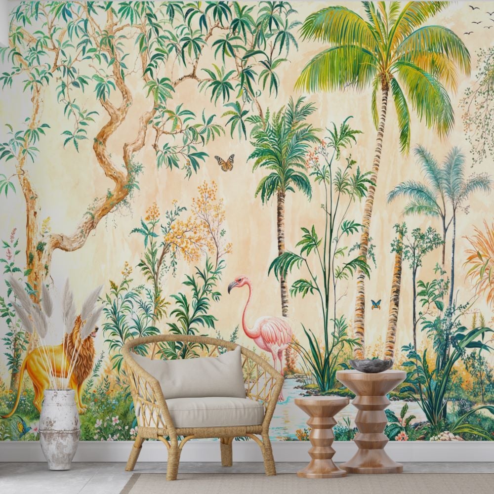 Palmiye Ağaçları,Flamingo Ve Egzotik Bitkilerle Tasarlanan Bu Tropikal 3D Duvar Kağıdı,Mekanlarınıza Canlı Ve Ferah Bir Doğa Atmosfer Katar.Özel Üretim.Bu Tropikal Orman Temalı 3D Duvar Kağıdı.
