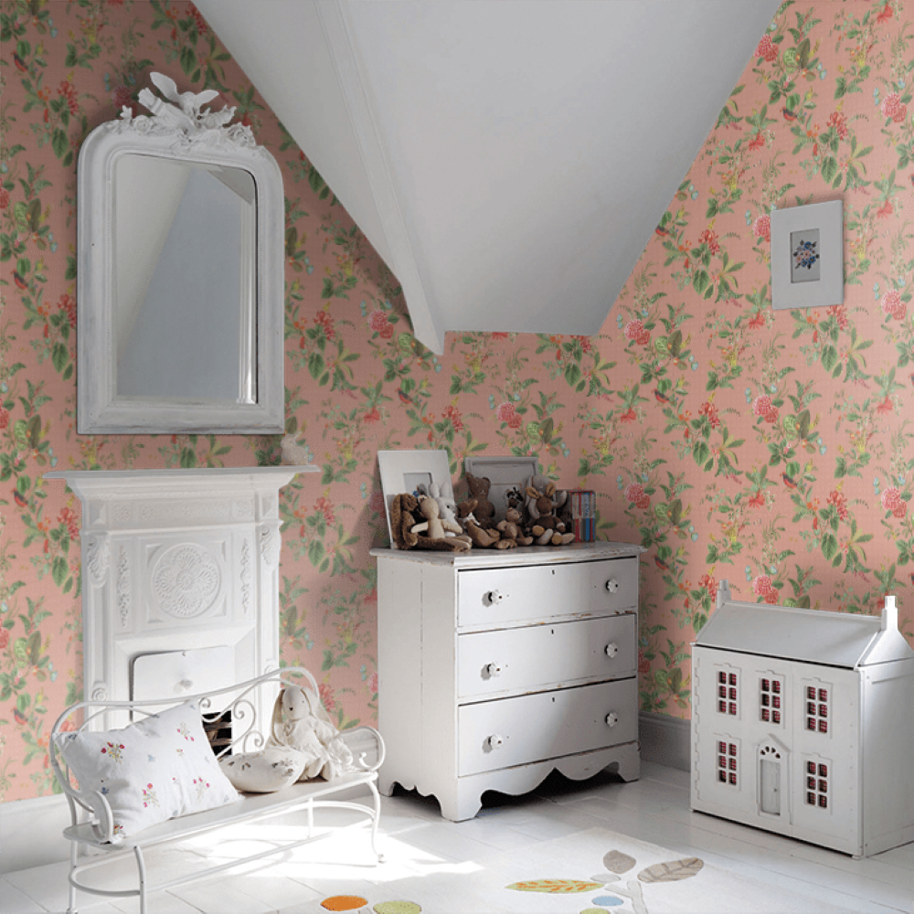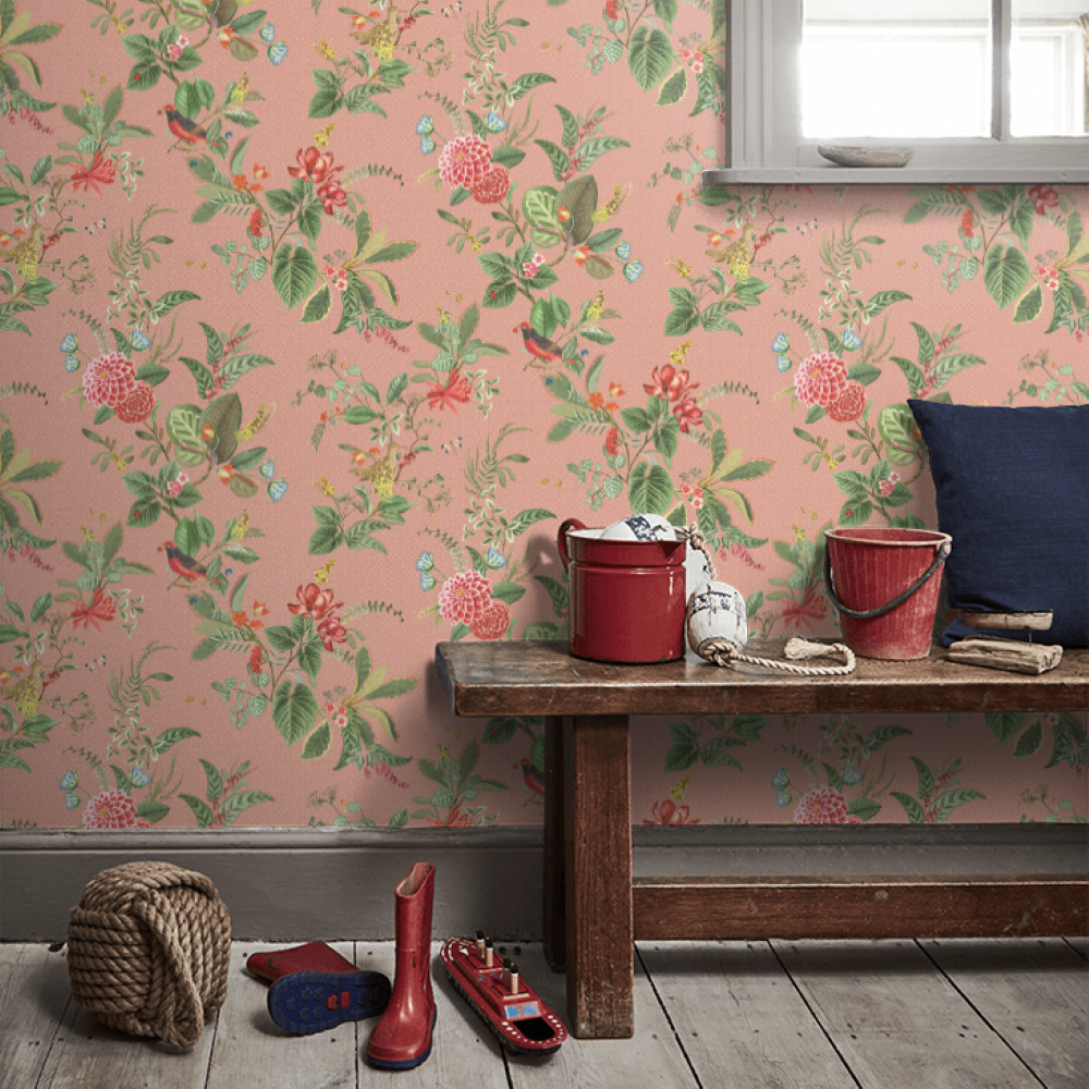 Özet Bilgi: Pip Studio, pembe rengin ferahlık veren görünümünden, palmiye ağaçları, cennet kuşları ve egzotik çiçeklerden ilham alarak, Palm Scene duvar kağıdını tasarlamıştır.
