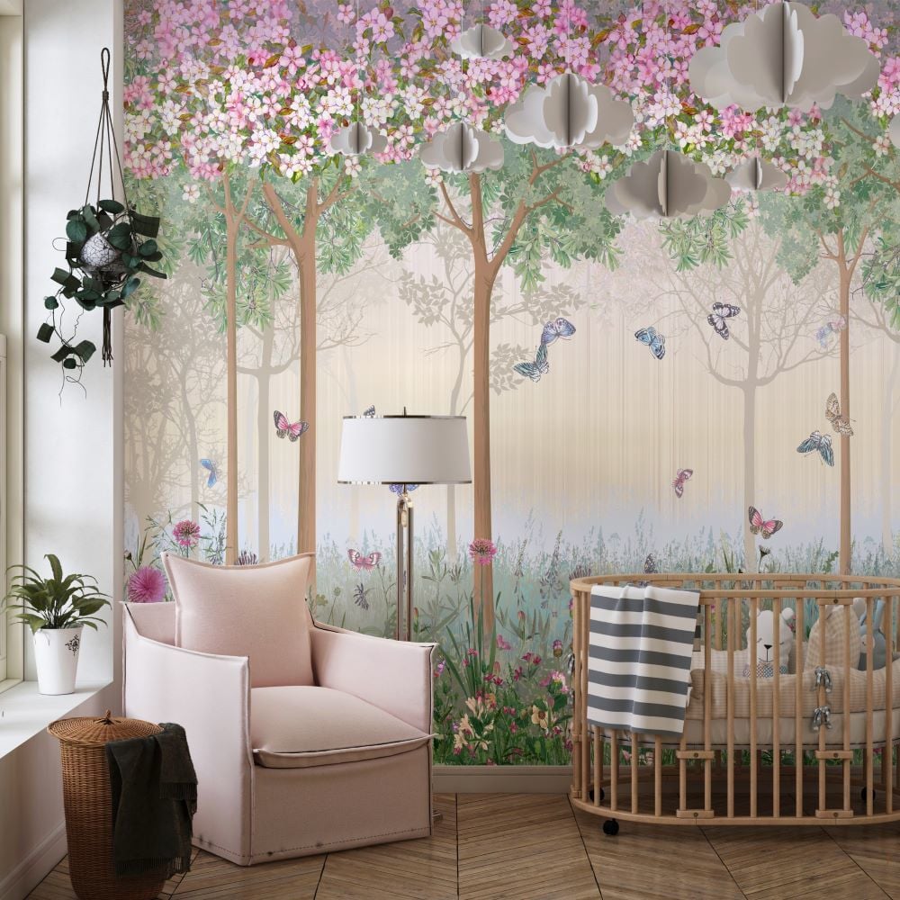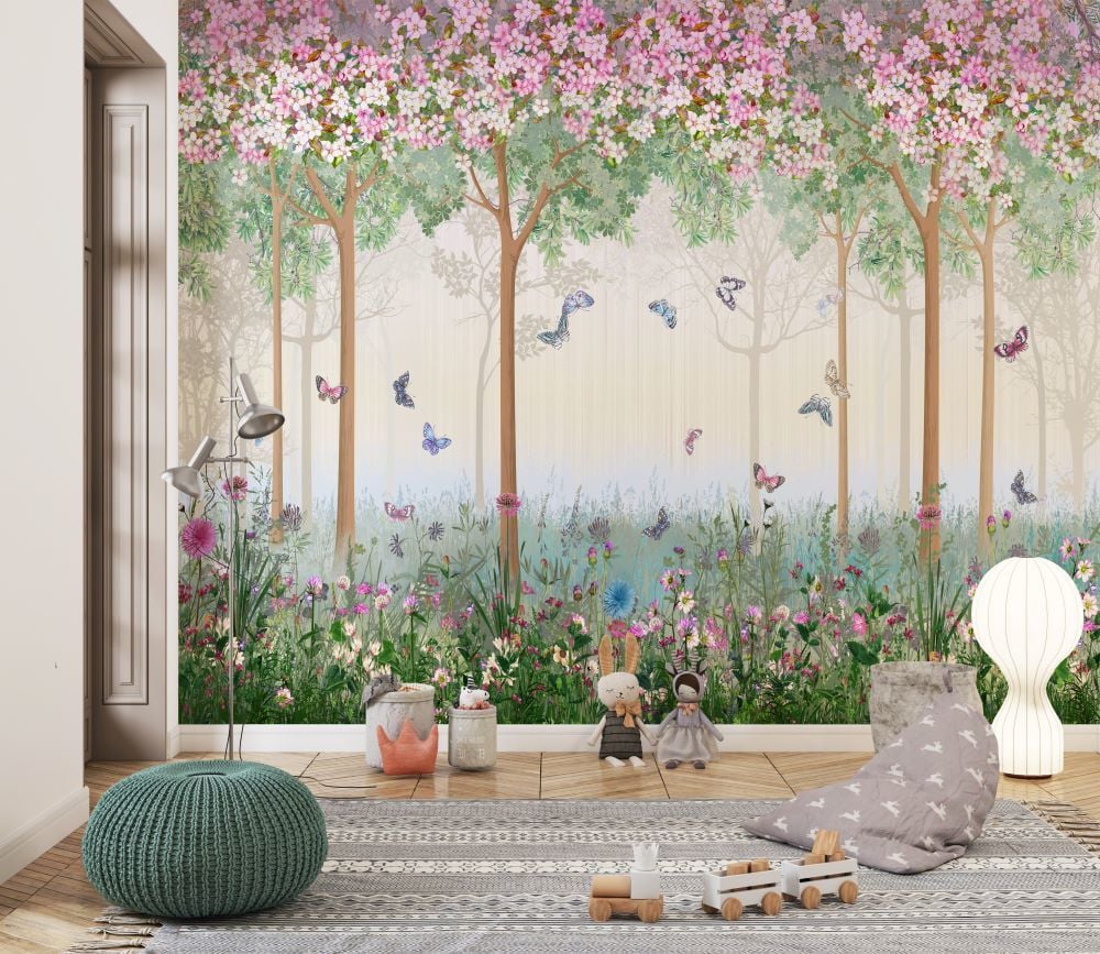 Pembe Çiçekli Şirin Ağaçlar Kelebekler Duvar Kağıdı