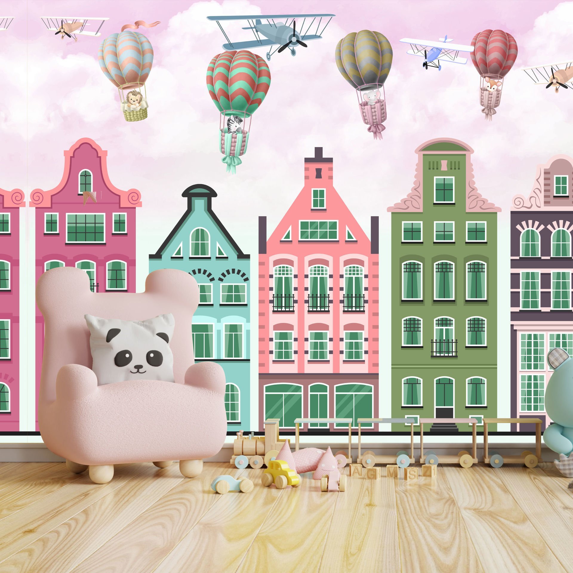 Pembe Zemin Renkli Binalar Hava Balonları Duvar Kağıdı