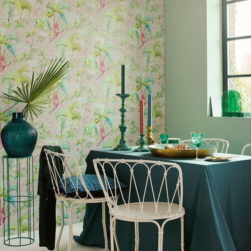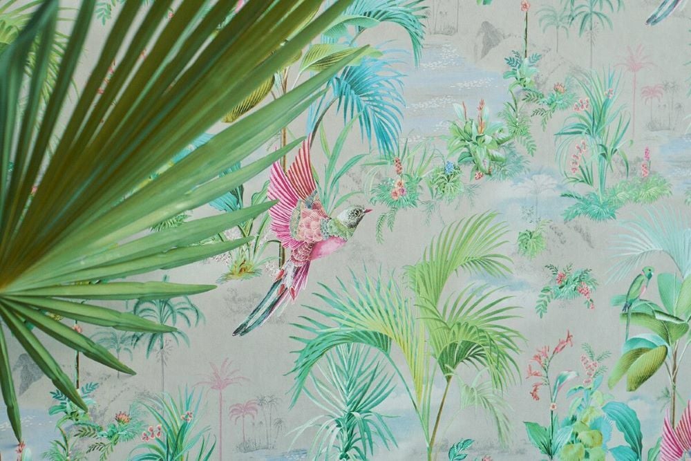 Özet Bilgi: Pip Studio, mavi rengin ferahlık veren görünümünden, palmiye ağaçları, cennet kuşları ve egzotik çiçeklerden ilham alarak, Palm Scene duvar kağıdını tasarlamıştır.