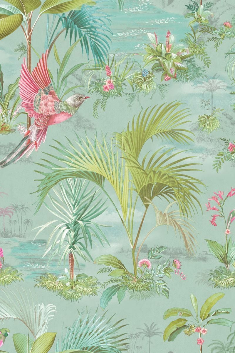 Özet Bilgi: Pip Studio, mavi rengin ferahlık veren görünümünden, palmiye ağaçları, cennet kuşları ve egzotik çiçeklerden ilham alarak, Palm Scene duvar kağıdını tasarlamıştır.