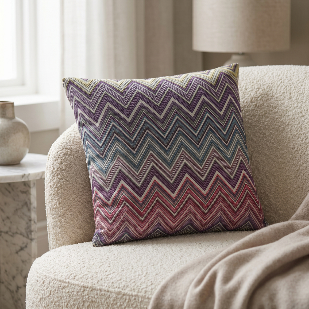 Renklerin katman katman geçişiyle oluşturulan bu özel zigzag tasarım, dekorasyona derinlik ve sofistike bir hareket kazandırır. Mor, bordo, mavi ve yeşil tonlarının dengeli dağılımı sayesinde bu dekoratif yastık, yüzeyinde prizmatik bir etki oluşturarak mekâna sanatsal bir dokunuş katar.