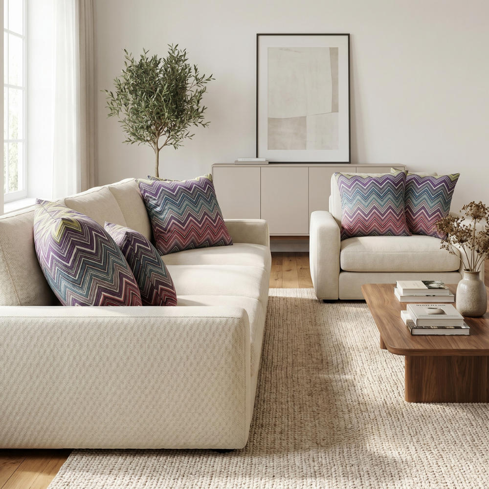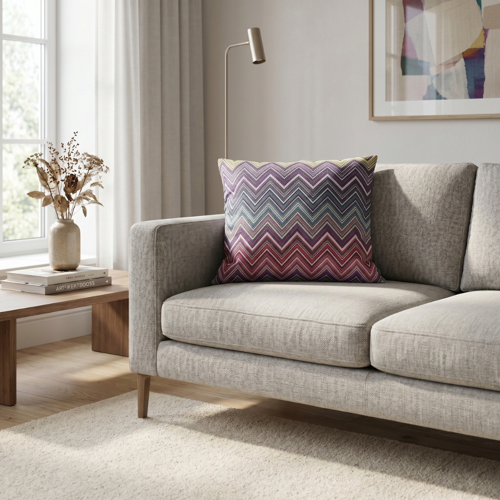 Zigzag (chevron) desenin katmanlı geometrisi ile çok renkli geçişlerin dengesi birleşerek mekâna derinlikli ve sanatsal bir atmosfer kazandırır. Bu özel tasarım yastık, modern ve premium dekorasyon anlayışını güçlü renk katmanlarıyla buluşturan zamansız bir stil sunar.