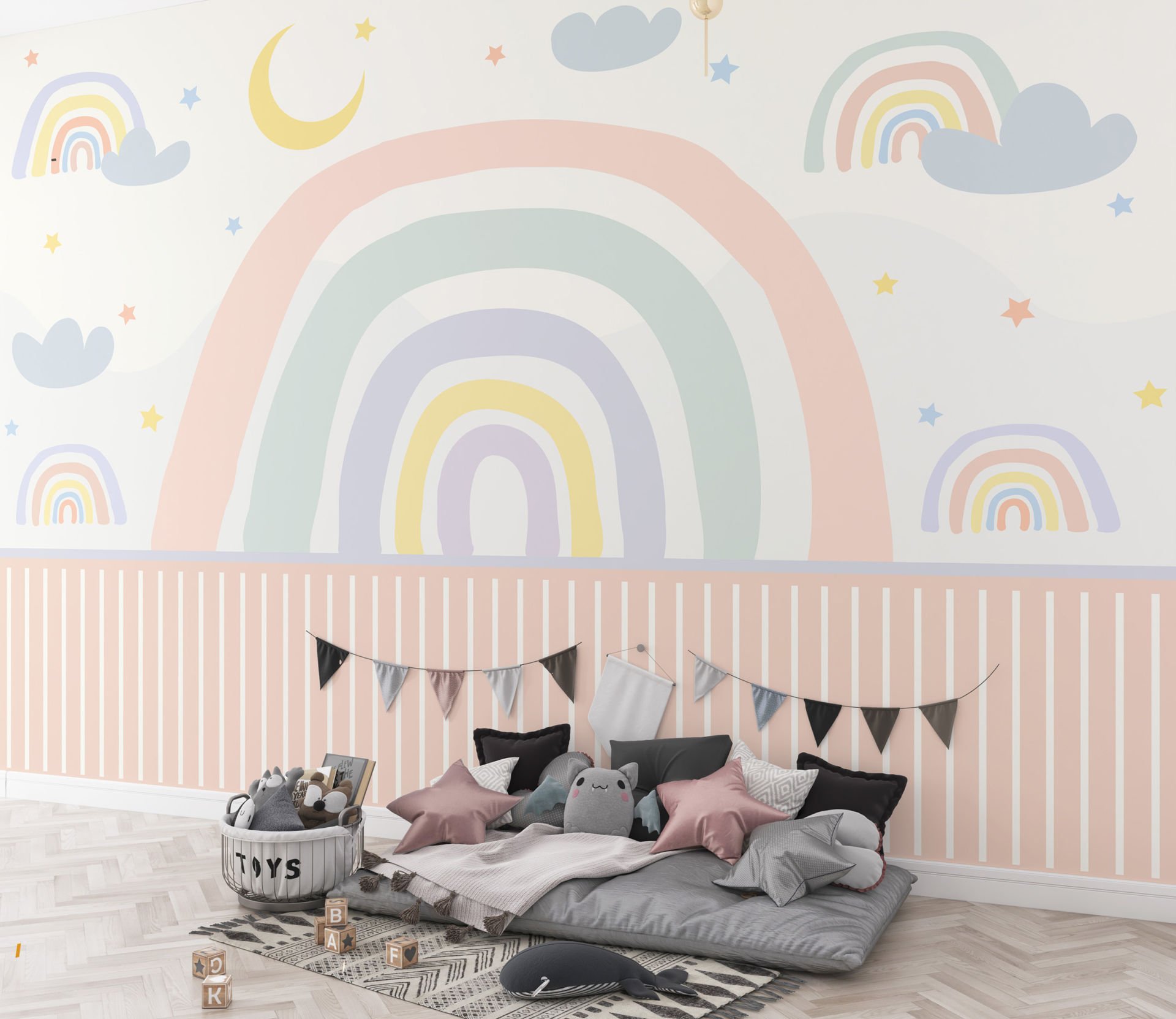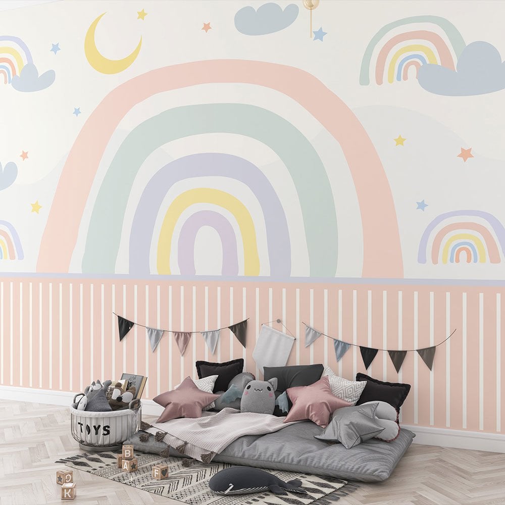 Pudra Pembe ve Mint Renk Çizgili Bordürlü Gökkuşağı Duvar Kağıdı